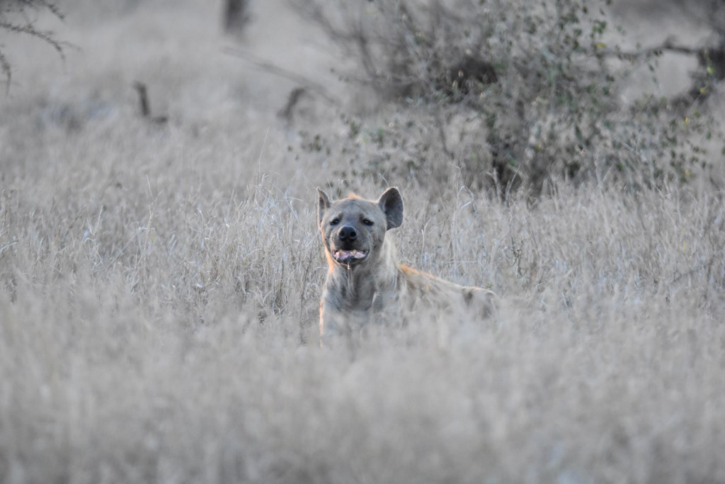 Le lendemain, nous nous levons à 5h pour être dès l'ouverture dans le parc. Notre 2ème étape nous conduit jusqu'au camp de Crocodile Bridge par des pistes logeant la rivière Crocodile. A peine sommes-nous arrivés dans le parc que nous croisons une meute de lycaons; il y en a une quinzaine sur la route. Eléphants, zèbres, girafes, koudous... les animaux habituels nous accompagnent tout au long de la journée. Dans l'après-midi, nous montons jusqu'au camp de Lower Sabie par la route puis redescendons par la piste à Crocodile Bridge. En cours de route, nous nous arrêtons dans un affût où nous dominons un point d'eau fréquenté par plusieurs éléphants; nous pouvons presque les toucher. Nous restons longtemps sur place oubliant presque que la nuit tombe très vite et que nous devons être au camp avant 18h. D'autant qu'en route, 2 hyènes et 1 guépard nous font perdre un peu de temps, ce qui est plutôt agréable et qu'un vilain bruit provenant du bas du véhicule nous fait ralentir, ce qui est plutôt inquiétant.