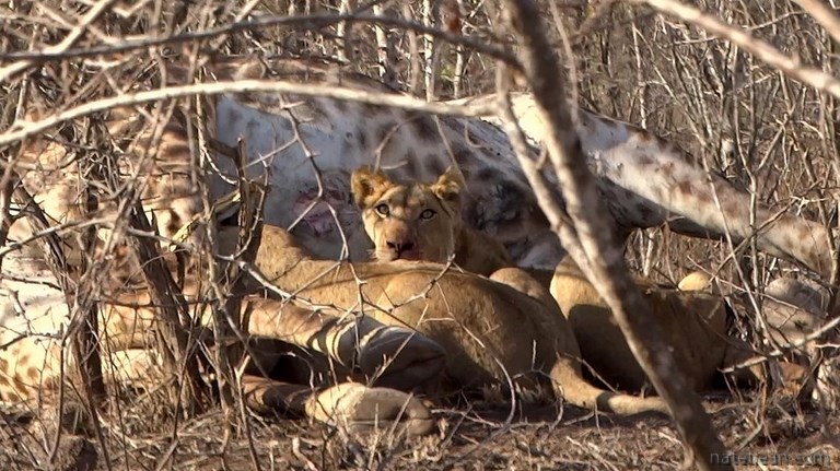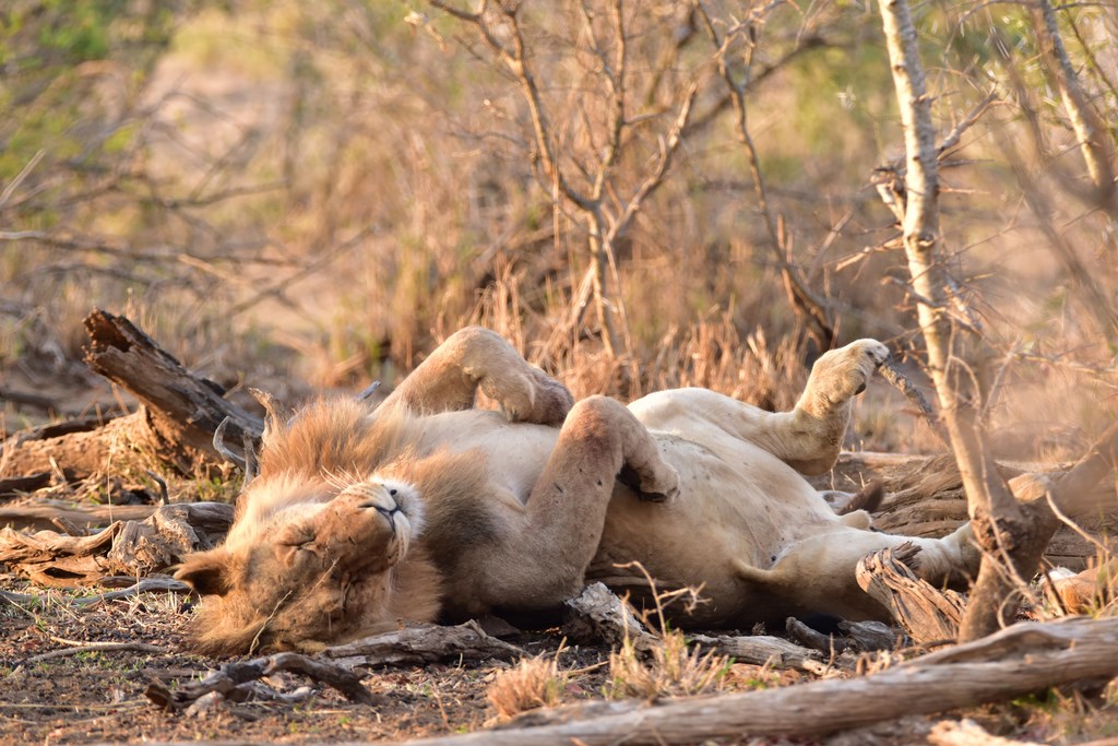 Après une nuit passée dans un charmant camping d'Hasyview, nous retournons voir les 2 lions que nous avions vus la veille. La girafe qu'ils ont tuée étant une grosse bête, il leur faudra certainement encore une journée pour s'en rassasier. Nous les retrouvons à la même place ou presque car l'un d'eux se balade maintenant d'un côté à l'autre du sentier passant même devant notre camping-car. Que demander de plus ? Nous n'irons pas plus loin aujourd'hui, les seuls lions nous suffisent. Nous en gardons pour les prochains jours.