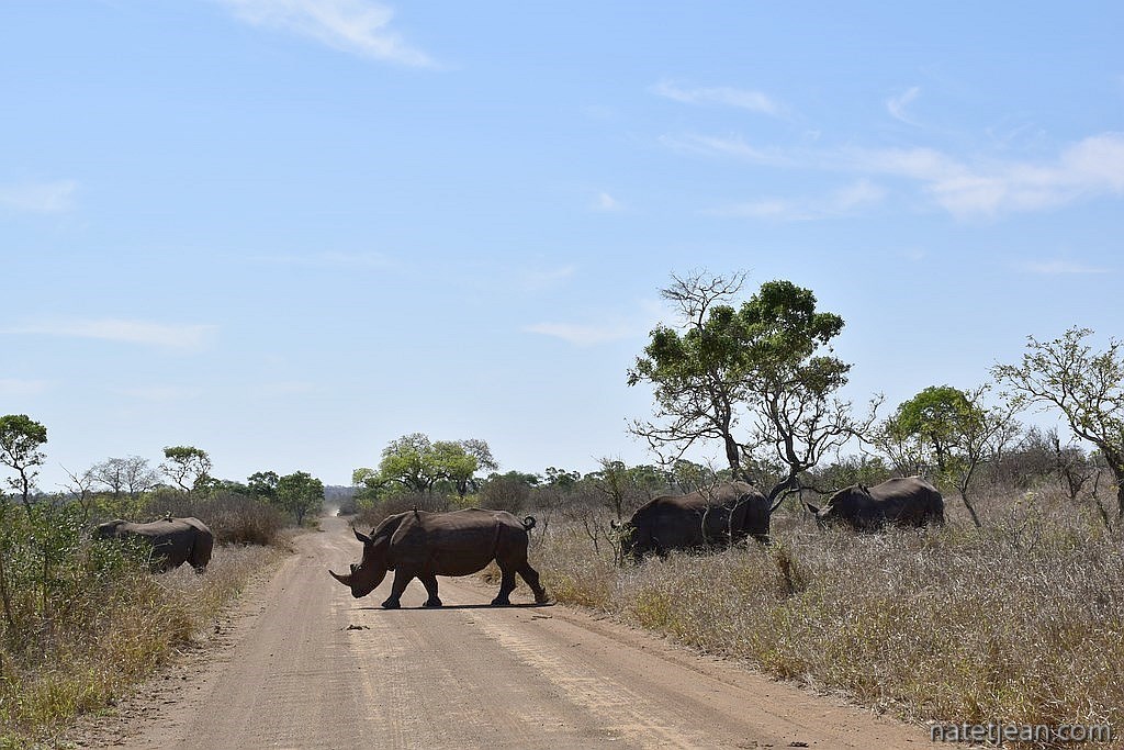 A peine entrés dans le parc, nous tombons nez à nez avec des buffles. Puis, nous suivons des éléphants et des girafes qui nous dirigent vers le point d'eau de Shitlhave. Ils ont rendez-vous avec d'autres animaux, zèbres, cobs, koudous, impalas, phacochères. Un peu plus loin et un peu plus tard dans la matinée, à Transport Dam, un barrage, ce sont plusieurs dizaines d'éléphants, des hippos, des crocos que nous surprenons en train de se baigner. Nous restons longtemps sur place pour apprécier le spectacle. Est-ce parce que la journée est si chaude (il fait plus 39°C) que les animaux accourent vers les points d'eau ? En continuant notre route vers le camp de Skukuza, nous apercevons un attroupement de véhicules. Un conducteur nous indique un léopard au loin. Caché par les herbes hautes, nous ne distinguons que sa tête; c'est notre premier léopard. Encore un peu plus loin, nous croisons des rhinocéros blancs. Jusqu'à présent, nous avons suivi les routes asphaltées du parc mais, pour rejoindre la sortie de Phabeni, nous empruntons une piste, la S3, qui longe la rivière Sabie. C'est l'assurance d'y apercevoir d'avantage d'animaux. Nouvelle concentration de voitures pour nous signaler, cette fois, des lions. 2 lions qui, ce matin, ont tué une girafe et qui commencent à la dévorer. Ils sont à 2 pas de nous. Nous sommes comblés. En quelques heures, nous avons vu la plupart des animaux que nous voulions voir. Ce soir, il y aura environ 300 photos à trier !