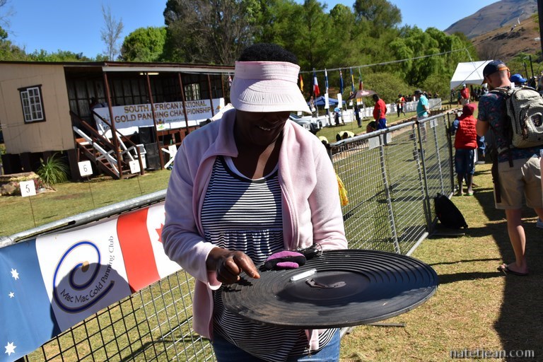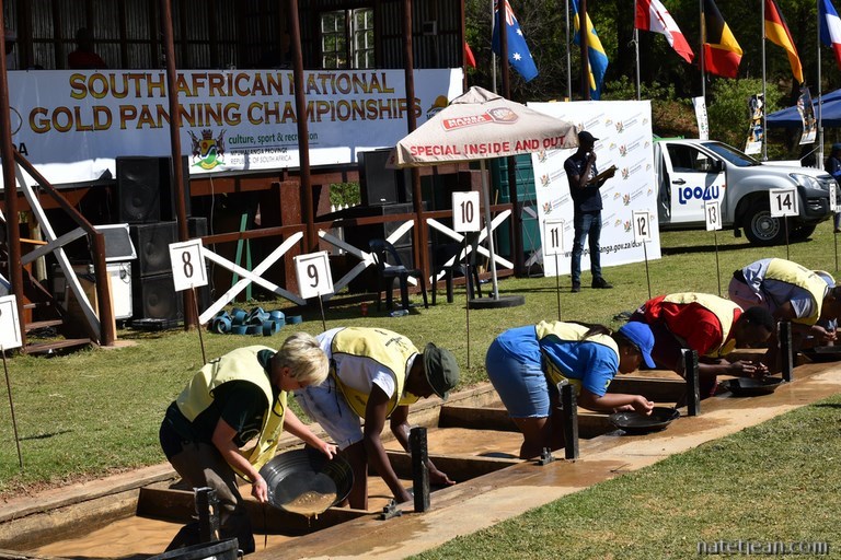 La route du jour suivant nous conduit à 2150 m d'altitude entre Sabie et Lydenberg avant de redescendre vers Pilgrim's Rest un petit village restituant la vie à l'époque de la ruée vers l'or. C'est un endroit sans intérêt si ce n'est qu'aujourd'hui, s'y déroule le championnat national de chercheurs d'or. Nous assistons à la compétition. Il s'agit de retrouver des paillettes d'or dans un bassin le plus rapidement possible.
