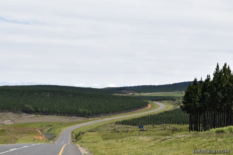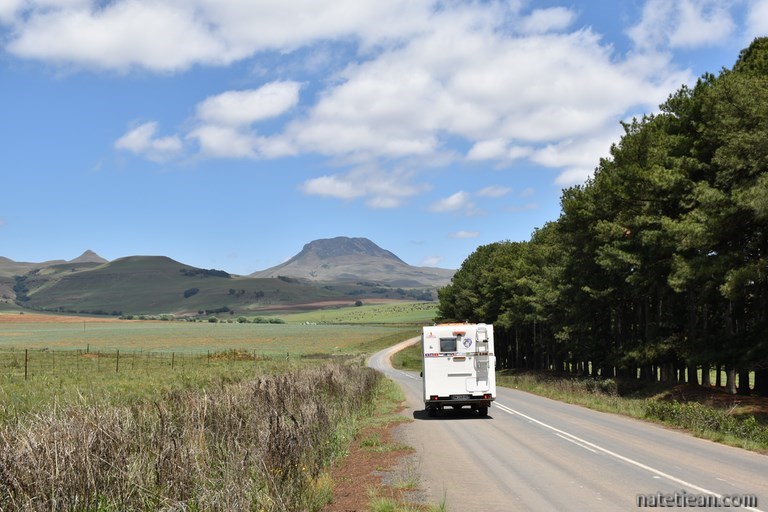 Puis, en 2 jours, nous parcourons 600 km pour rejoindre Tembe Elephant Park situé au nord de l'état du Kwazulu Natal et en bordure du Mozambique. Les routes, longeant le Swaziland, sont impeccables et peu empruntées. Ce sont des routes de montagnes à plus de 1000 mètres d'altitude qui traversent de grandes exploitations forestières. Nous apprécions les paysages et la tranquillité que nous avions perdus depuis notre arrivée à Nelspruit. Les villes ou plutôt les villages sont plus clairsemés et l'on retrouve les cases au toit de chaume et les petites bicoques de bord de route des campagnes swazi. Les kilomètres se font rapidement si bien qu'on en profite pour faire un détour par Baberton, une ancienne ville de la ruée vers l'or. Baberton n'a pas beaucoup d'intérêt pour nous sinon de nous confirmer que tout n'est pas clinquant en Afrique du Sud; on s'en doutait un peu. On fait aussi une halte à Piet Retief, une petite ville le long de la N2, afin de faire remplir notre bouteille de gaz.