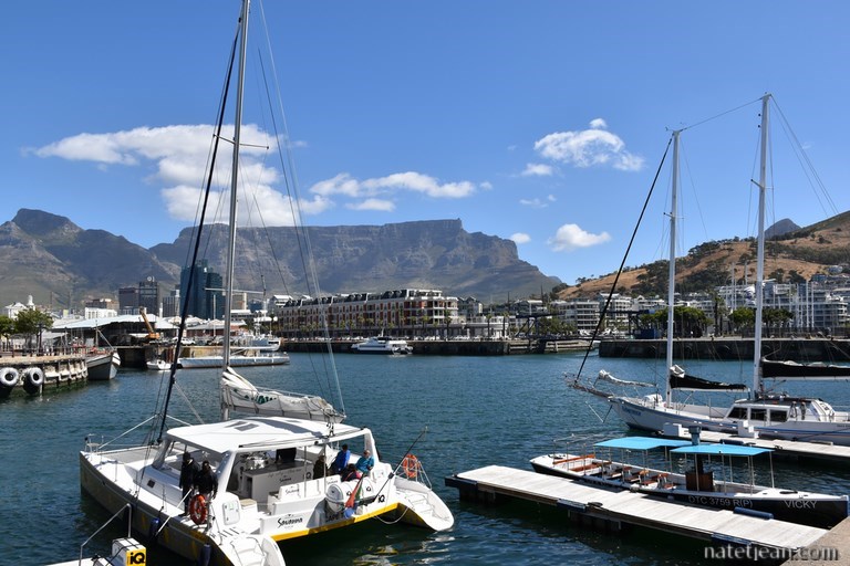 Grâce à IOverlander, une appli pour smartphone regroupant plein d'infos de voyageurs et notamment des endroits où dormir, nous disposons, à Cape Town, d’un emplacement idéal où bivouaquer sur le Waterfront, un des endroits les plus touristiques et les plus modernes de la ville. Il s’agit d’un parking en bord de mer, en face de Robben Island, gardé le jour et sécurisé la nuit par des caméras. Nous y retrouvons Aline et Georges avec qui nous passons la soirée. Dans l’après-midi, nous visitons le quartier ; il n’y a rien de typique au Waterfront mais, c’est sympa. Il y a surtout des restaurants, des boutiques de souvenirs, des boutiques de luxe, de beaux appartements donnant sur la marina et beaucoup de touristes.