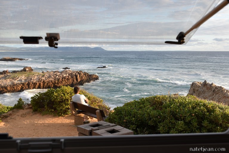 Nous nous arrêtons ensuite à Hermanus. Après une balade et un déjeuner au restaurant dans le centre-ville, nous longeons la route côtière où nous trouvons un bel emplacement où bivouaquer, Lansbaai Beach, dans un des quartiers résidentiels d'Hermanus. C'est encore une fois un point de vue sur l'océan, le long du Cliff Path, une promenade de 10 km longeant la mer. Dans cette ville touristique chic, c'est un endroit qui vaut de l'or; en-dessous, une petite crique de sable blanc, un peu plus loin la plage de Kammabaai où nous passons la journée et devant nous la mer et ses baleines de Biscaye qui de juin à décembre fréquentent la Walker Bay.