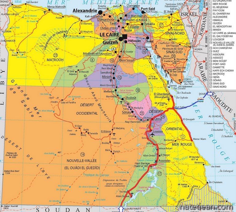 ...C'était donc le plan d'il y a quelques semaines. Depuis, nous avons encore changé d'avis car nous avons appris que depuis fin septembre, l'Arabie Saoudite délivrait, en quelques heures et sans difficultés, via Internet, des visas de tourisme de 3 mois à entrée multiple et en discutant avec un chauffeur routier à la douane d'Argin, nous avons également appris qu'il y avait des bateaux de Safaga vers Duba an Arabie Saoudite. Donc à peine arrivés au bord de la Mer Rouge, à Safaga, le lendemain matin, nous ne filons pas sur les plages mais à la pêche aux informations pour savoir s'il est possible d'embarquer vers l'Arabie Saoudite. Malheureusement aujourd'hui, c'est vendredi et tout est fermé. Nous n'obtenons donc pas beaucoup de réponses sinon la confirmation que le ferry existe bien. C'est déjà ça. Voilà donc un nouveau programme : départ en ferry depuis Safaga vers Duba en Arabie Saoudite puis Emirats, Oman, retour Emirats et Arabie Saoudite puis visite de la Jordanie et Israël d'où nous partirons en direction de l'Italie par bateau. Ce parcours qui finalement ressemble un peu à l'itinéraire initial, avec en prime un séjour plus long en Arabie Saoudite et un passage en Israël, devrait prendre environ 4 mois. Par contre, nous zappons le Sinaï et la visite du Caire car, d'une part, nous connaissons et d'autre part, comme le départ d'Egypte se fera à Safaga, nous préférons rester sur cette côte pour profiter de la Mer Rouge.