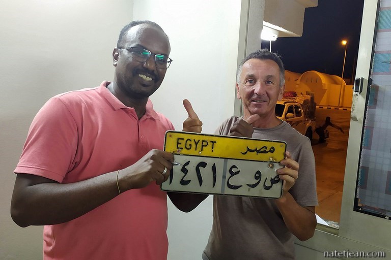 Longue journée aujourd'hui à Argin... 5 heures pour sortir du Soudan et 5 heures supplémentaires pour rentrer en Egypte. Il est 18h45 et il fait nuit noire lorsque nous quittons enfin les bureaux des douanes avec notre camping-car maintenant immatriculé en Egypte.