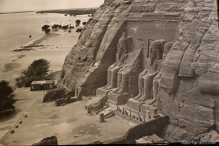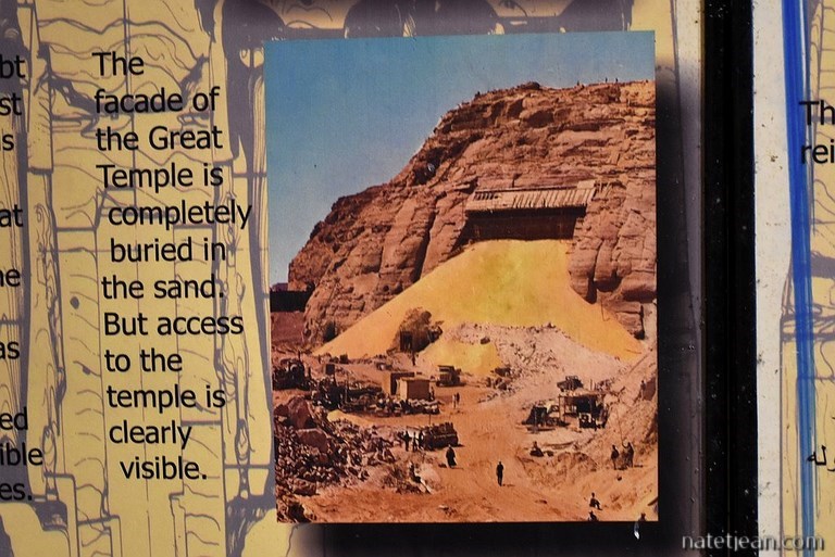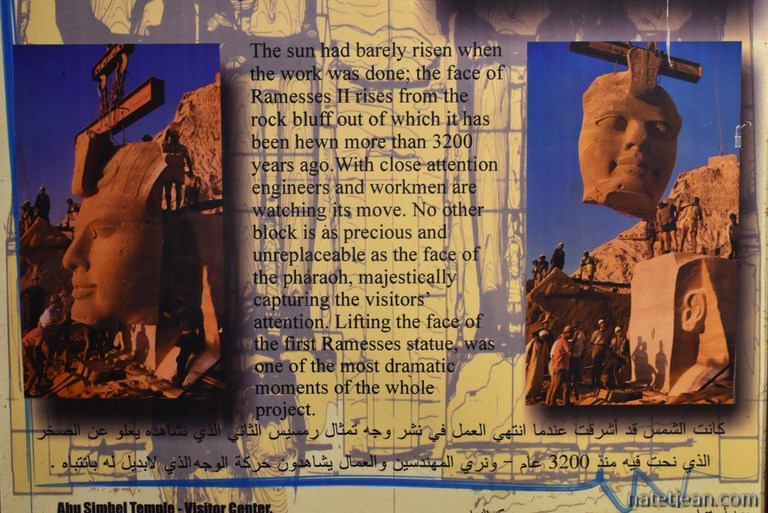 Arrivés à Abou Simbel, nous avons le privilège, comme tous les voyageurs d'ailleurs, de bivouaquer sur le parking des temples qui surplombe le lac Nasser. On en profite pour visiter l'intéressant musée qui se trouve sur place et qui retrace le sauvetage des temples d'Hathor et Nefertari qui risquaient d'être noyés lors de la mise en service du nouveau barrage d'Assouan dans les années 60. En 1963, alors que les eaux du lac artificiel Nasser montaient, des équipes internationales ont découpé puis réassemblé pièce par pièce les 2 temples 65 mètres plus haut. Ce démontage est en soi exceptionnel mais pas unique car plusieurs temples situés le long du Nil dont celui de l'île de Philae à Assouan ont aussi bénéficié de ce projet. On remet la visite des temples le lendemain car il y a déjà 2 bus de touristes présents. Demain matin, très tôt, il y aura certainement moins de monde.