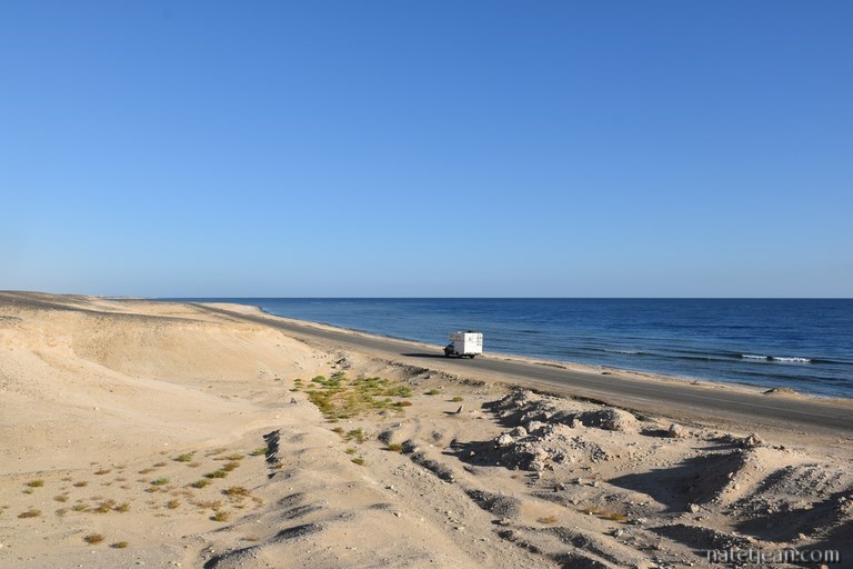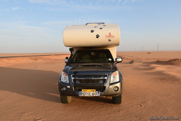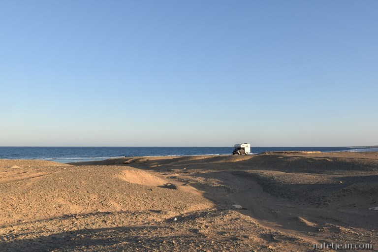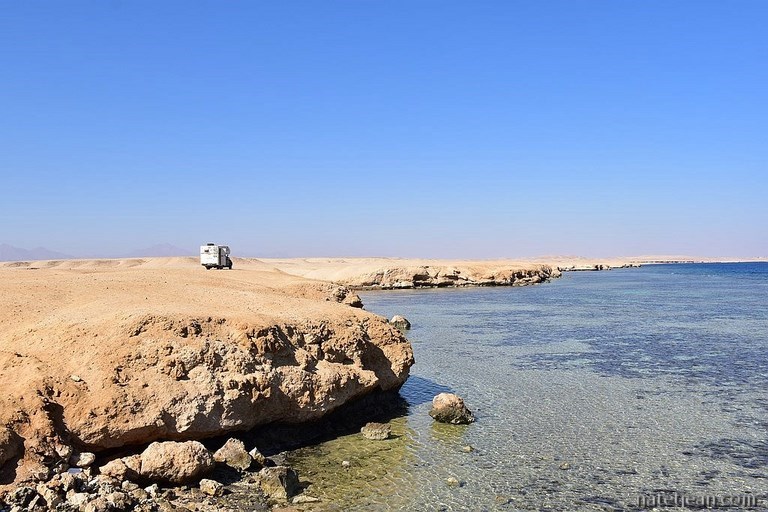 N'étant plus qu'à 2 jours du départ de notre bateau, après avoir passé la matinée à Marsa Egla, nous reprenons la route vers Safaga avec un arrêt à El Quseir pour la nuit. Le lendemain mercredi, alors que nous sommes presque arrivés à Safaga, l'agent de la compagnie Alkahera nous prévient que la traversée est reportée à cause du mauvais temps. Comme on n'a pas très envie d'attendre, on retourne chez Namma, la compagnie maritime que nous avions contactée en premier. Cette fois, nous avons des renseignements précis et finalement, nous décidons de partir avec eux mais... il faudra quand même attendre que la mer se calme. Pour patienter, on retourne à Soma Bay, notre plage préférée à Safaga. Dans la journée, on a fait tout ce qu'on avait à faire avant de prendre le bateau : laver le véhicule, faire le plein d'eau, faire les courses et m'acheter une tenue saoudo-compatible avec voile intégré en vue de notre arrivée en Arabie car si le dress-code a changé dans ce pays et que l'abaya et le niqab ne sont plus imposés aux étrangères, il n'est pas sûr que tous les Saoudiens soient au courant de ce changement.
