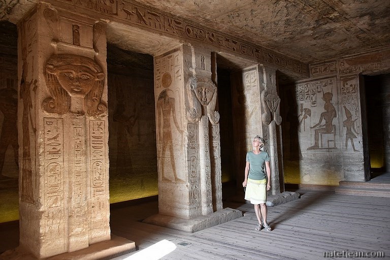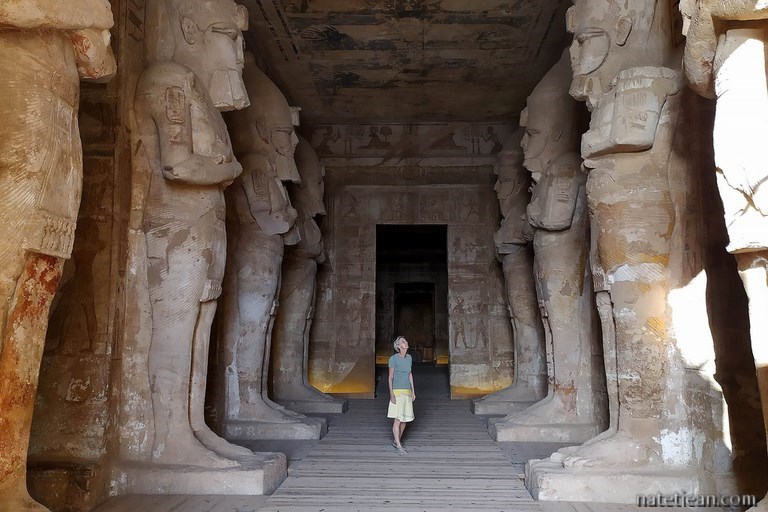 Attendre le lendemain est un mauvais calcul car lorsque nous nous réveillons, il n'y a plus 2 bus mais une vingtaine. Qui a dit que l'Egypte était désertée par les touristes ? Malgré l'affluence, on apprécie beaucoup cette première visite d'un temple égyptien (en vérité, ce n'est pas la première visite puisque nous sommes déjà venus en Egypte plusieurs fois mais c'est la première durant ce voyage). Construits sous le règne de Ramsès II (1295-1229 av. JC), ces 2 temples taillés dans le grès sont dédiés à plusieurs dieux dont le pharaon Ramsès II et à une des nombreuses épouses de celui-ci, Nefertari. Statues monumentales, bas-reliefs, fresques, emplacement majestueux au-dessus du lac, sauvetage hors normes, etc... Il n'en fallait pas plus pour faire d'Abou Simbel un mythe.