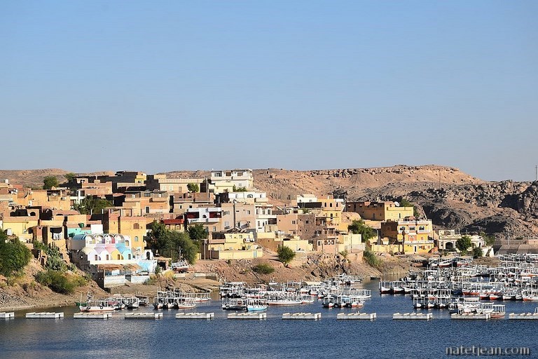 Au réveil, en faisant le tour du village, on s'aperçoit que l'on est au cœur d'un village nubien très touristique où les visiteurs débarquent en felouque dans le cadre d'excursions. Les petites maisons colorées avec leurs toits surmontés d'un dôme sont pour la plupart des hôtels ou des restaurants et les magasins, des boutiques de souvenirs. C'est joli mais ça manque d'authenticité. Un peu plus loin, au moment d'embarquer pour l'île de Philae, le monde et la visite express proposée (1 heure aller-retour avec le transfert en bateau et la visite du temple) nous dissuadent d'y aller. C'était peut-être un "immanquable" sur la liste des sites à visiter mais justement, il y a trop de monde qui ont peur de le louper. On préfère aller visiter le musée nubien qui retrace l'histoire et la culture de la Nubie, la région qui couvre le territoire entre Khartoum au Soudan et Assouan. En fin de matinée, nous nous baladons dans la ville d'Assouan, le long du Nil et dans les petites rues au milieu du souk. C'est agréable même si on est sollicités sans arrêt par les rabatteurs et les chauffeurs de taxi. Heureusement qu'ils ne sont pas insistants. On avait prévu de rester 3 jours sur place mais finalement, une journée aura suffi à voir ce qui nous intéressait. Nous quittons la ville dans l'après-midi pour nous rendre à Kom Ombo, un peu plus au nord où nous souhaitons visiter les temples de Sebek et d'Haroeris. Nous faisons une halte un peu avant, à Daraw, où nous trouvons un emplacement où passer la nuit le long d'un canal d'irrigation. Alors que nous tournons pour aller nous garer, une voiture arrive à pleine vitesse et veut nous doubler. On l'entend freiner puis on la voit piler à notre hauteur. On l'a échappé belle. Evidemment, le chauffeur et les passagers nous engueulent même si cela fait un moment que Jean a mis le clignotant pour tourner. On n'a pas encore éclairci l'usage du clignotant en Egypte. Ce que l'on a vu c'est que, pour tourner, personne ne l'utilise mais que, quelquefois, un chauffeur peut le mettre et dans ce cas cela signifie qu'il va tout droit (ça me fait penser à une histoire de blonde)...