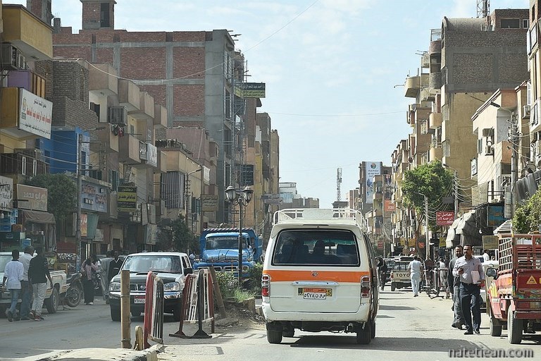 Pour rejoindre les temples de Kom Ombo et celui d'Edfou, nous avons emprunté la route qui longe la rive est du Nil, une route fatigante avec une circulation assez dense et de nombreux dos-d'âne. A partir d'Edfou, nous quittons cette route pour prendre la route du désert qui mène à Louxor, à l'ouest de la vallée du Nil. Cela nous fait faire un détour mais c'est plus rapide.