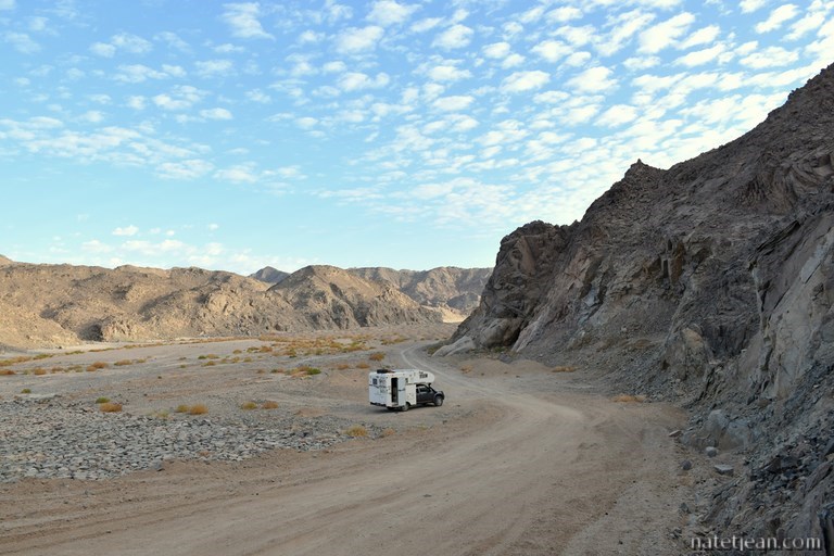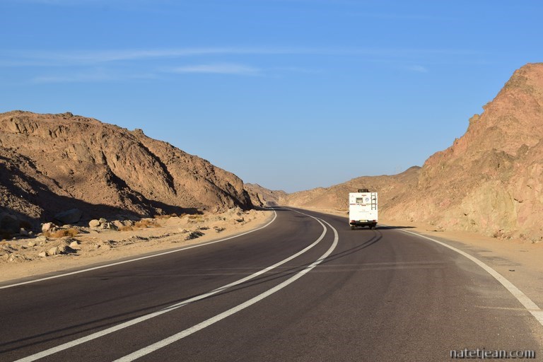 Nous mettons 1 heure 30 pour faire les 60 km jusqu'à Qena et pour quitter enfin la vallée du Nil. A partir de Qena, nous prenons la superbe route à 2 x 2 voies qui traverse le désert arabique et c'est beaucoup plus reposant. En fin d'après-midi, on s'arrête dans un canyon pour bivouaquer. L'endroit est à 1 ou 2 kilomètre de la route et nous permet de passer une nuit tranquille.