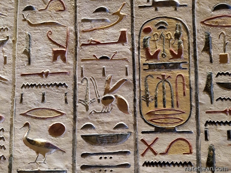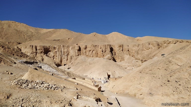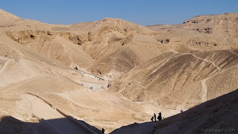 Le lendemain, nous nous rendons, en camping-car, dans la Vallée des Rois qui se trouve sur l'autre rive du Nil où nous visitons quelques tombes (3 comme l'autorise le ticket d'entrée) puis le temple d'Hatchepsout.