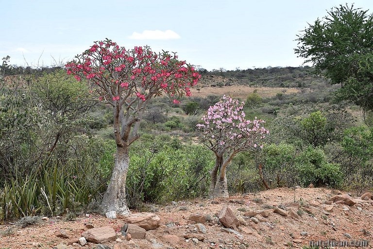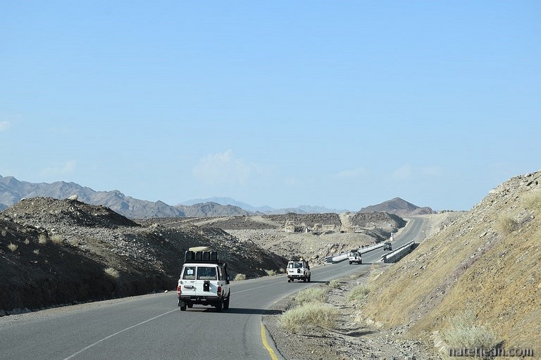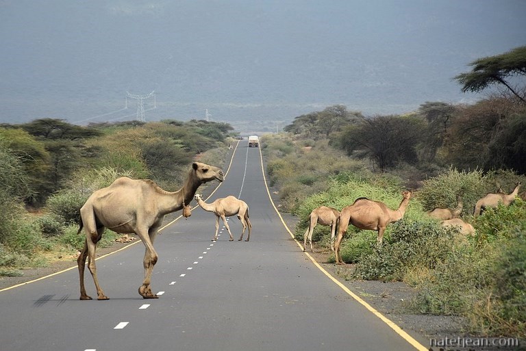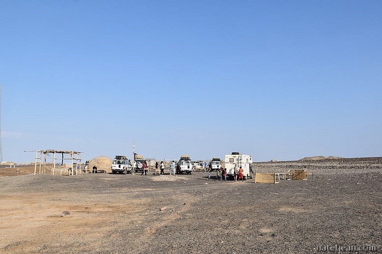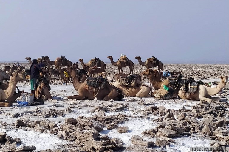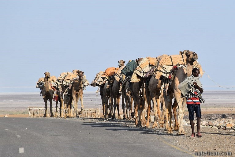 Nous entrons dans le désert du Danakil en milieu d'après-midi après avoir perdu 2400 mètres d'altitude. Les paysages deviennent de plus en plus secs et rocailleux à mesure que nous descendons. La température, quant à elle, monte jusqu'à 43°C et un vent chaud nous sèche la gorge. Sur la route (asphaltée et en parfait état), nous croisons les caravanes de dromadaires transportant du sel et conduites par des Afars. Les Afars, de confession musulmane, appartiennent à une ethnie présente non seulement dans cette partie de l'Ethiopie mais aussi en Erythrée et à Djibouti, 2 pays dont la frontière est très proche ; l'Erythrée étant à une trentaine de kilomètres d'Hamedela, le village où nous installons le camp pour la nuit.