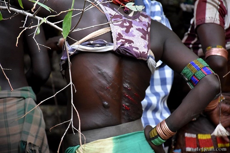Nous embarquons donc le guide avec nous et nous suivons ses indications pour rejoindre un village totalement isolé à 37 km de Turmi. Le Bull Jumping célèbre le passage de l'adolescent vers l'âge adulte. Il réunit le clan mais aussi les autres membres de la communauté hamer. Cette cérémonie se déroule en plusieurs phases. Tout d'abord, les femmes de la famille de l'adolescent se font flageller pour témoigner du courage de leur clan. Nous n'assistons pas à cette flagellation mais nous en voyons les stigmates sur le dos des femmes ; de larges cicatrices ouvertes et sanguinolentes. Aïe ! Ça fait mal.