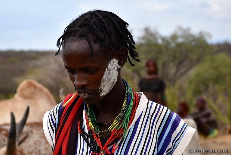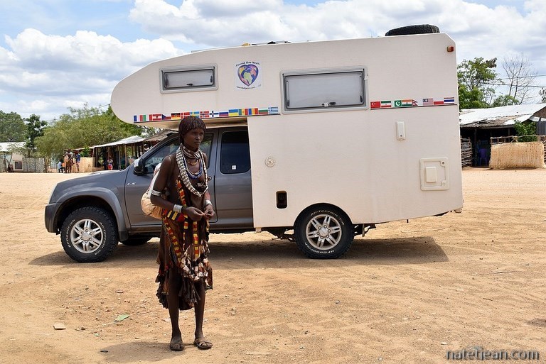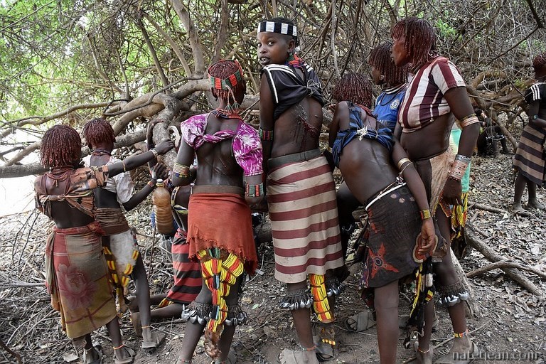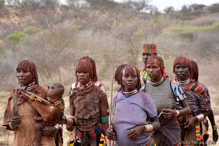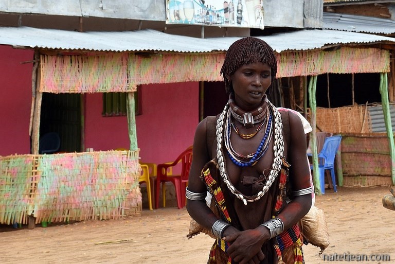 Les Hamer sont un peuple très particulier. Dans leur apparence tout d'abord. Les femmes ont la peau recouverte de beurre et de terre de la tête au pied à la manière des femmes Himba en Namibie. Elles portent, comme ces dernières, des jupes en peau. Lorsque nous les croisons dans leur village ou sur la route, elles ont les seins nus mais recouverts de nombreux colliers alors qu'à Turmi, elles portent le plus souvent un tee-shirt. Les hommes, eux, ont des pagnes très courts et, sur la tête, des coiffes faites de bijoux ou de plumes. Dans leur mode de vie aussi, les Hamer sont très différents. Ils vivent dans une région très chaude et sèche et disposent de très peu d'eau. Ils cultivent donc très peu voir pas du tout. Leur seul bien est leur bétail. Ils ne se nourrissent principalement que de lait et de sang. On se demande comment il est possible de vivre dans des conditions aussi rudimentaires, dans une région où, en plus, sévit la malaria.