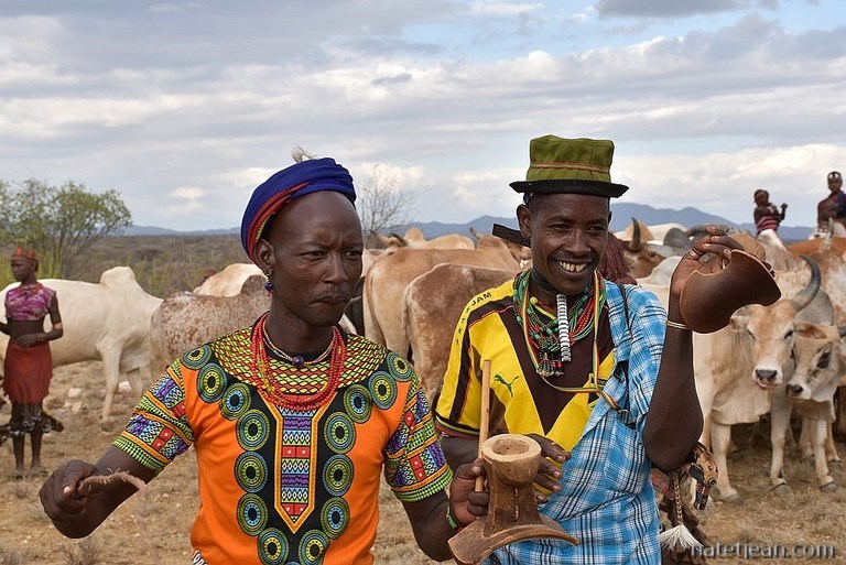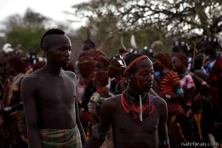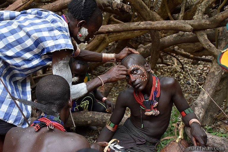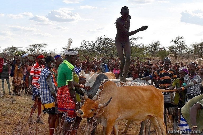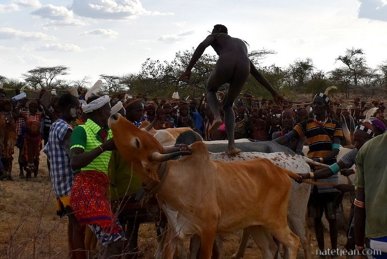 Ensuite, il y a une "séance de maquillage" puis tout le monde monte sur une colline. Les femmes dansent en jouant de la trompette et agitant les grelots qu'elles ont à leurs chevilles tandis que les hommes regroupent le troupeau. Lorsque l'adolescent est prêt, on aligne quelques bœufs sur lequel il doit monter debout en faisant 2 allers-retours. S'il y parvient, il aura réussi son initiation, sinon... Aujourd'hui, ce sera un succès.