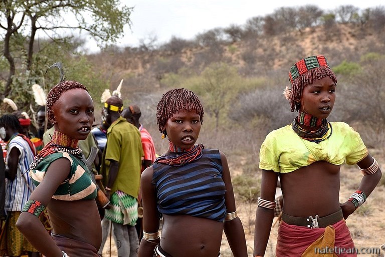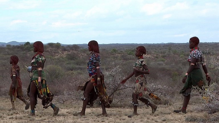 La vallée de la rivière Omo, très isolée au sud-ouest du pays, est habitée par 16 tribus différentes. Au sud, vivent les Hamer, une tribu très particulière dans son mode de vie et dans son apparence. Pour les rencontrer, nous prenons la direction du village de Turmi en direction du lac Turkana près des frontières kenyane et sud-soudanaise. Notre guide Petit Futé (qui justement ne l'est pas trop ...futé) nous indiquait une nouvelle route asphaltée jusqu'à Turmi. En réalité, à partir de Key Afer, la fameuse route qui a bien des trous se transforme en piste qui, elle aussi, n'est pas très reposante. Nous arrivons à Turmi vers midi et alors que nous sommes attablés pour déjeuner, un guide nous aborde pour nous proposer d'aller voir une cérémonie traditionnelle hamer, le oukouli ou "Bull Jumping".