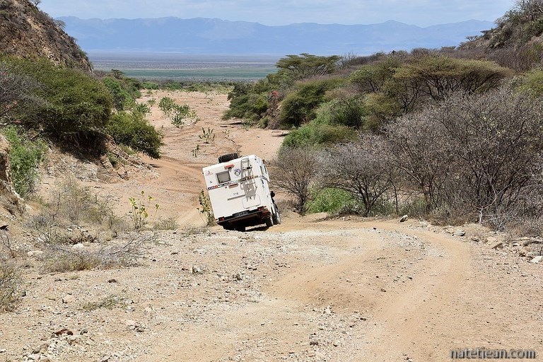 Pour quitter Turmi, nous avons décidé, sur les conseils de chauffeurs rencontrés au camping, de prendre la piste qui passe par la Réserve Stephanie et rejoint la route asphaltée à Weyto. Hier, nous l'avions suivie sur une vingtaine de km pour nous rendre au Bull Jumping et elle était très bonne, bien meilleure que celle que nous avions prise pour venir. Seulement, une bonne piste pendant 20 km ça ne signifie pas qu'elle soit bonne partout et effectivement il y a quelques passages très difficiles notamment au moment de redescendre en altitude où il faut franchir des éboulis. Nous regrettons presque notre choix d'autant qu'il faut supporter, en plus, une température proche de 45°C. Notre seule consolation est que le paysage est magnifique.