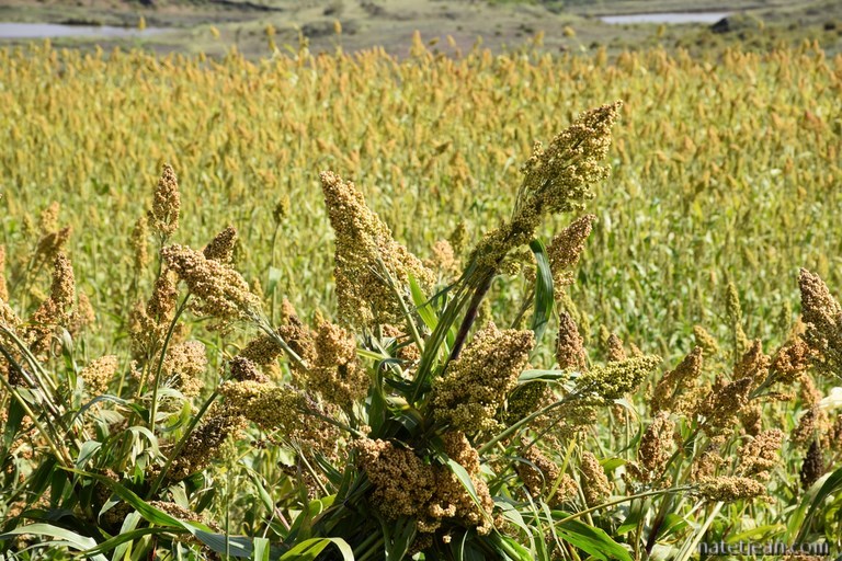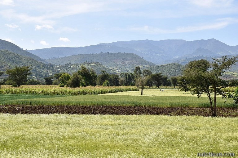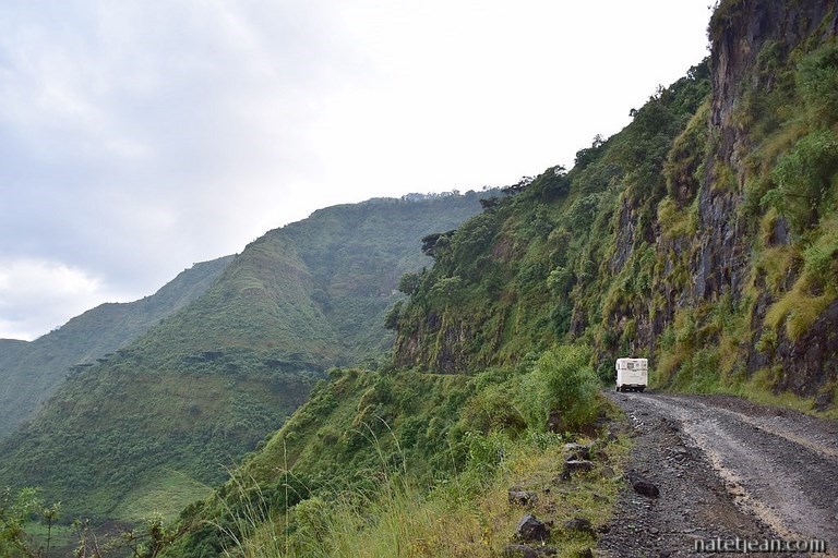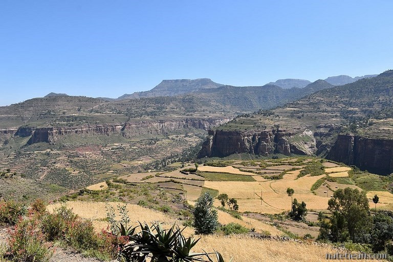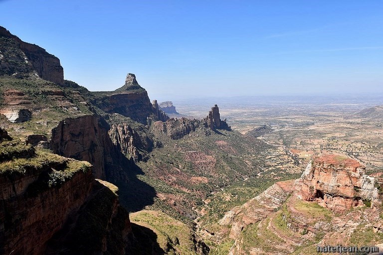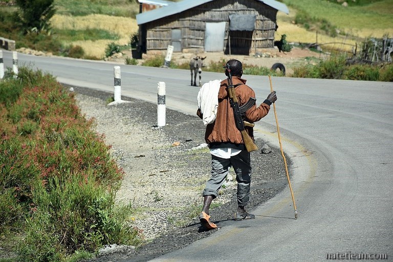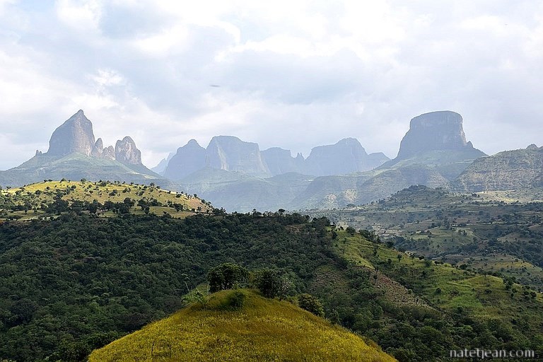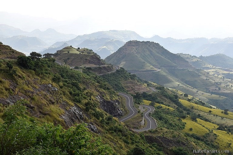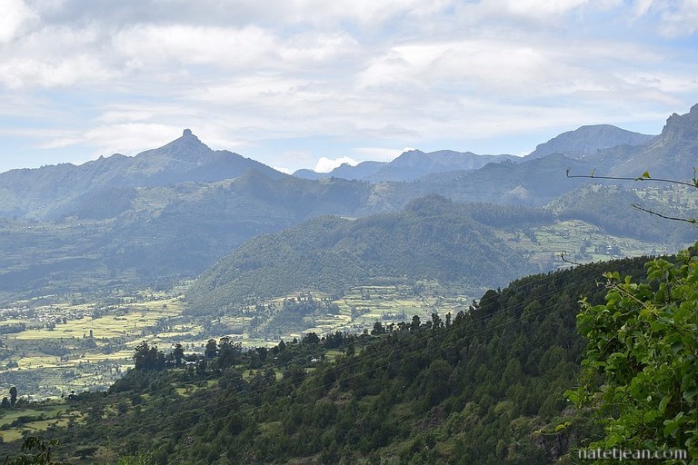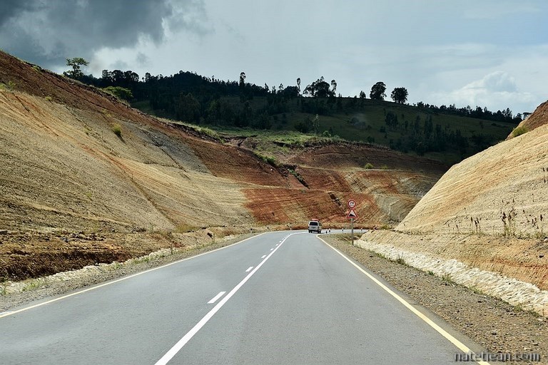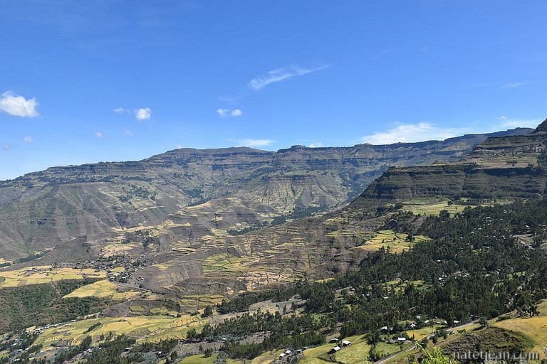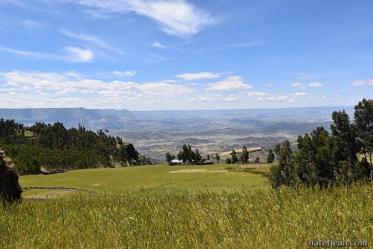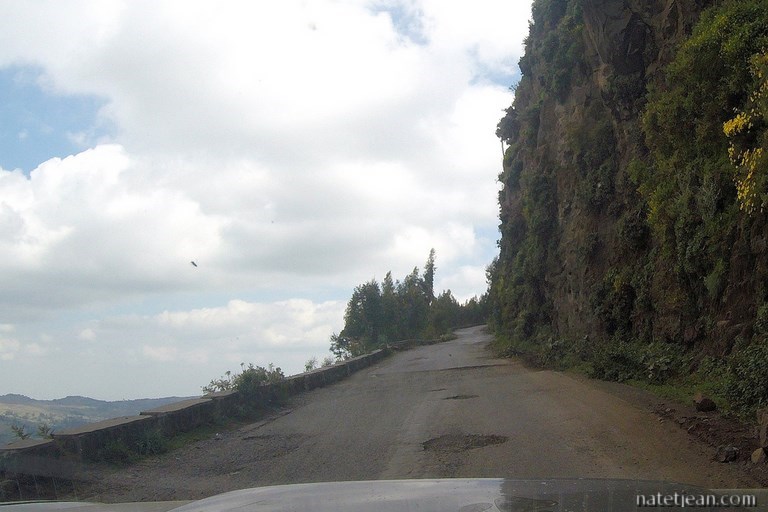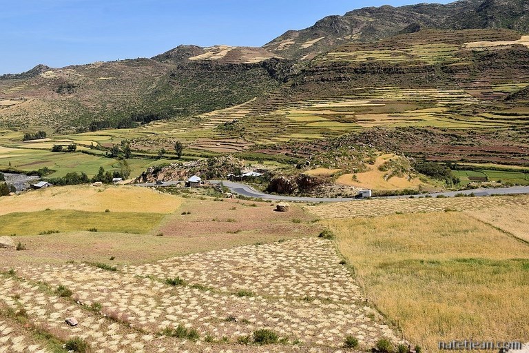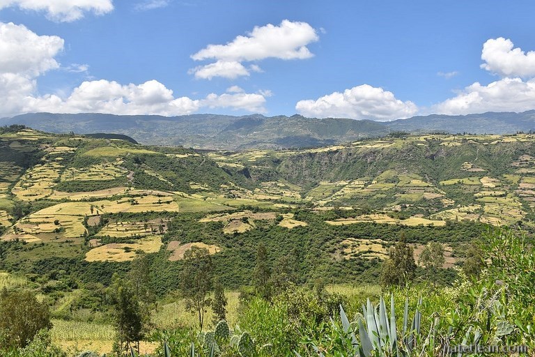 Au réveil, nous prenons le temps d'admirer le magnifique paysage ainsi que la route vertigineuse que nous avons empruntée la veille. Il nous reste encore 12 km à faire avant d'arriver à Debark et avant de retrouver une bonne route. En attendant, la pluie a creusée la piste et c'est au pas que Jean enchaîne les épingles. Passé Debark, nous suivons, pendant 40 km, la route traversant un plateau situé à 2700 mètres d'altitude. Ici, comme partout en Ethiopie, pas une parcelle de terrain qui ne soit cultivée, le tout formant un patchwork de jaune, orange, vert, les couleurs des céréales (sorgho, blé, tef, etc...), principales cultures que l'on trouve en Ethiopie. Comme tout est cultivé, les bêtes, très nombreuses, sont privées de pâturages et se retrouvent le long des routes et même sur les routes et nous accompagnent tout le long de nos trajets. C'est très pittoresque !