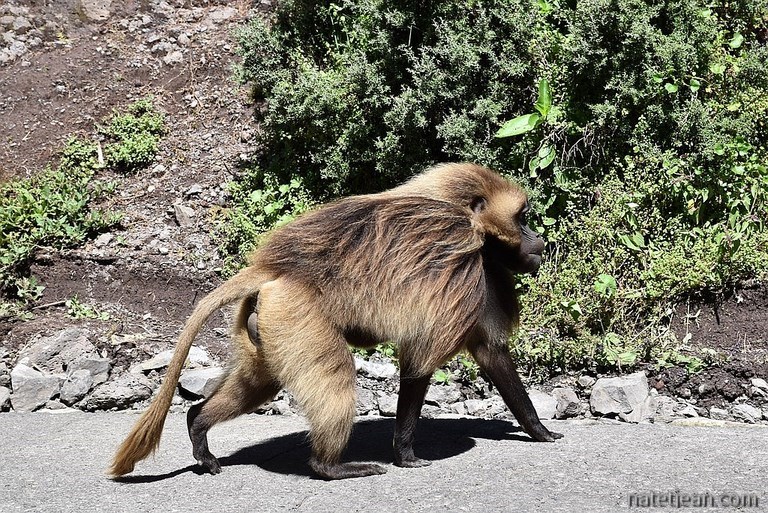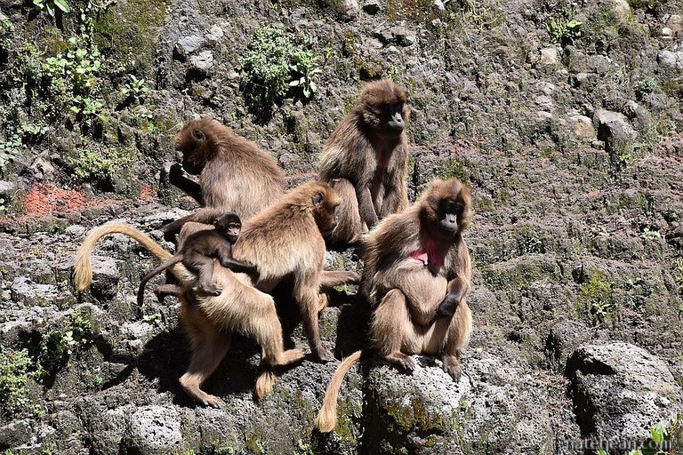 Comme nous sommes seulement jeudi et que nous nous sommes fixés de faire les marché de Sanbete et de Bati qui ont lieu respectivement le dimanche et le lundi, nous ralentissons un peu le rythme et faisons une pause de deux jours à Debre Birhan puis une autre d'une journée à Shoa Robit au Kalid Hotel. De Debre Birhan à Shoa Robit, la route est splendide. Culminant à 3200m d'altitude, elle offre des vues vertigineuses sur le pays Afar. Au col de Termaber, alors que nous sortons d'un tunnel, nous sommes surpris par des babouins Gélada qui se régalent de la nourriture que leur jettent les passagers des bus. A 3200m, il fait froid mais, une fois arrivés à Shoa Robit, 2000m plus bas, il fait très chaud et, pour une fois, nous sommes contents d'être dans un hôtel et de profiter du confort d'une chambre.