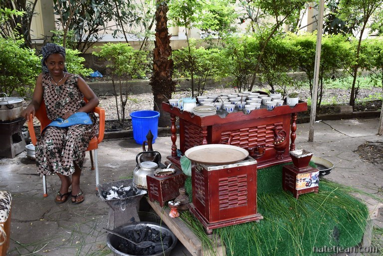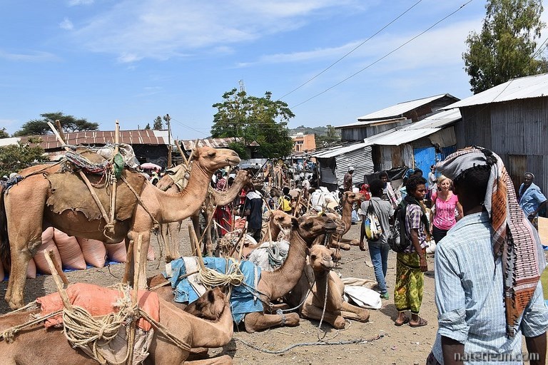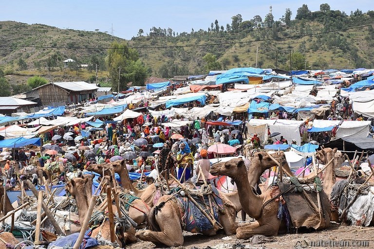Le lendemain, après une heure de route, nous arrivons à Bati. Nous sommes surpris d'y être plusieurs fois apostrophés en français. L'explication est que nous ne sommes pas très loin de Djibouti et qu'il y a pas mal de Djiboutiens de passage ou même installés dans la ville. Avant de faire la visite du marché, nous prenons le temps de boire un bon café éthiopien dans le stand de rue devant lequel nous sommes garés. En plus de faire une pause, cela nous permet de faire connaissance avec les femmes qui s'occupent des échoppes et de leur confier, l'air de rien, le véhicule à surveiller. Le marché de Bati est fréquenté par les populations Oromo, Amhara et Afar et c'est là le principal attrait pour nous car en dehors des gens, ce qui y est proposé à la vente n'est que pacotille, ustensiles usuels à la vie quotidienne ou bétail. Partout, les gens sont charmants. Contrairement à ce que nous ont habitués les Ethiopiens, ici, personne ne réclame ou ne mendie même lorsque nous prenons des photos. Un vendeur de parapluies insiste même pour nous prendre en photos avec un de ses articles. Après midi, alors que le marché bat son plein, nous refaisons la route en sens inverse, retraversons Kombolcha et nous arrêtons à Dessié sur le parking du Awash Greenland Hotel (zéro pointé !) pour y passer la nuit.