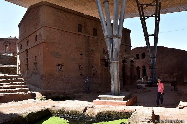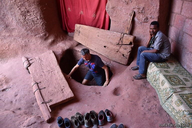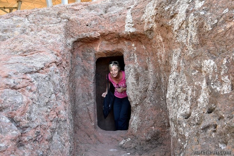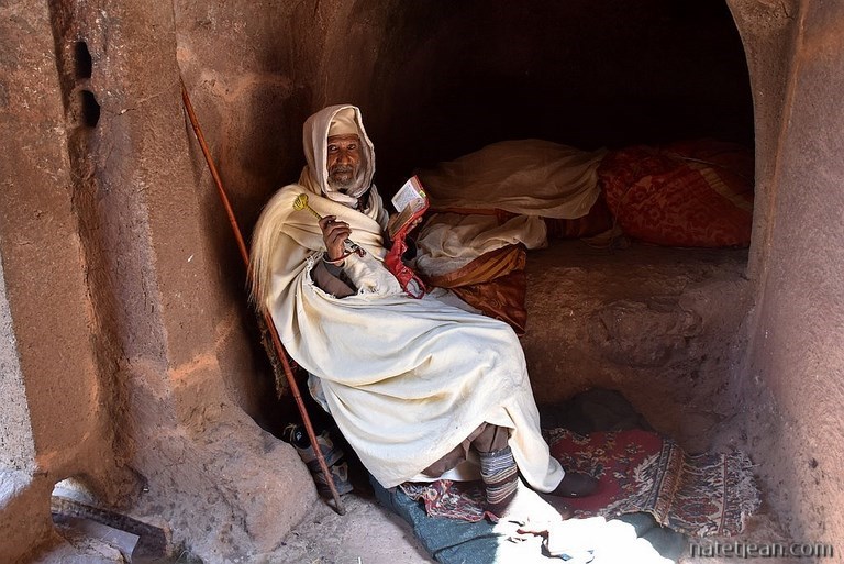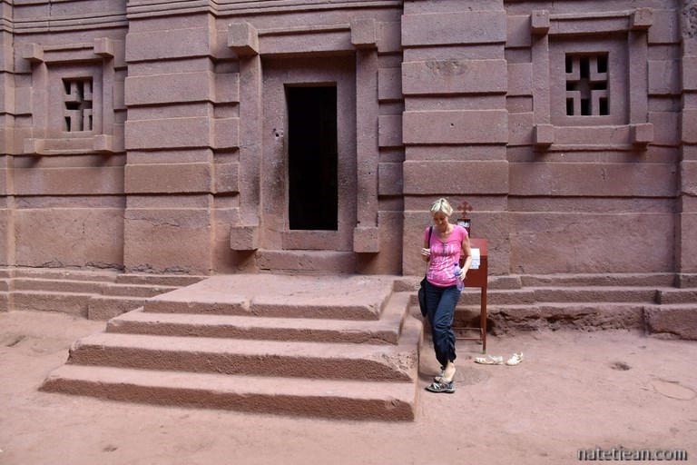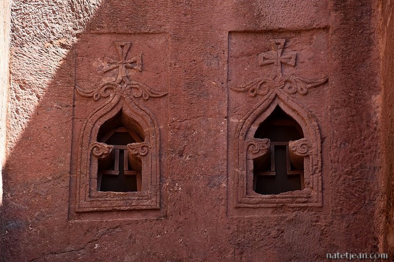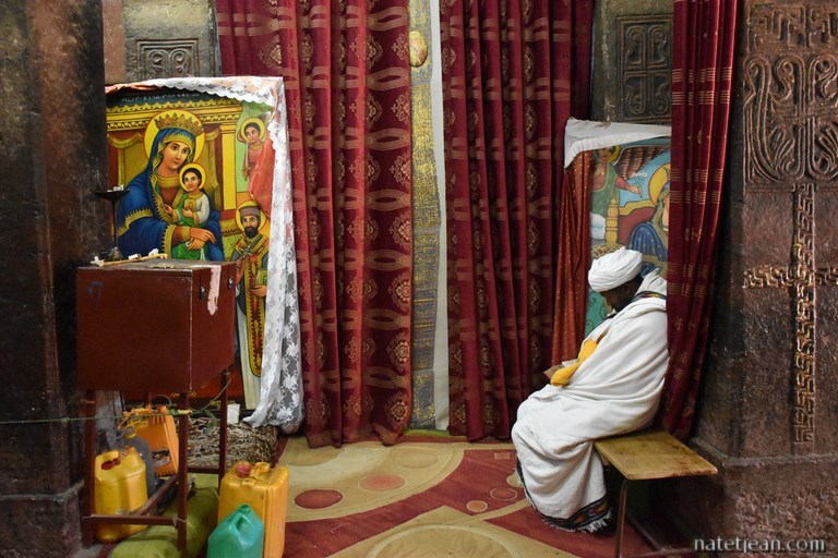 Les 11 églises monolithes de Lalibela sont réparties en 2 groupes, nord et sud. Nous visitons celles du nord durant la première matinée et celles du sud le lendemain matin. Comme leur sommet affleure le sol, nous devons suivre des canaux ou des tunnels pour accéder à leur entrée ce qui, en plus de l'aspect culturel et religieux de ces édifices, est assez distrayant. La plus intéressante des églises est sans doute celle dédiée à Saint Georges en forme de croix. Comme nous ne sommes ni en période de fête ni en période de pèlerinage, on ne sent pas de ferveur religieuse particulière. C'est d'avantage l'aspect touristique qui ressort de ces visites. Cependant, même si Lalibela est très touristique, les enfants et les guides improvisés ne sont ni envahissants ni casse-pieds ce qui nous permet de faire toutes les visites seuls à notre rythme. Dans la journée, nous croisons un couple de voyageurs français, Tati et Denis, qui vient d'arriver de Djibouti avec un 4x4 Toyota Hilux équipé. Nous nous donnons rendez-vous le soir pour dîner et échanger quelques infos. Tati et Denis font un tour en Ethiopie puis ils descendront jusqu'en Afrique du Sud pour rentrer en France dans 6 mois.