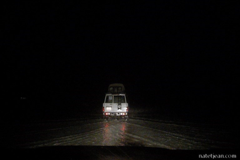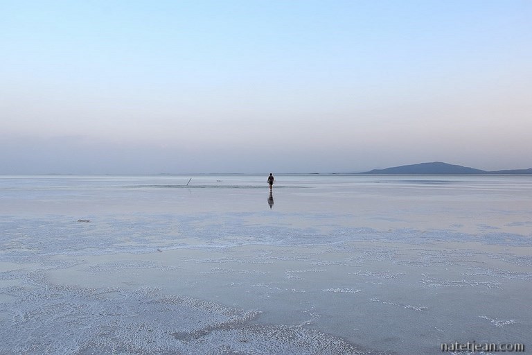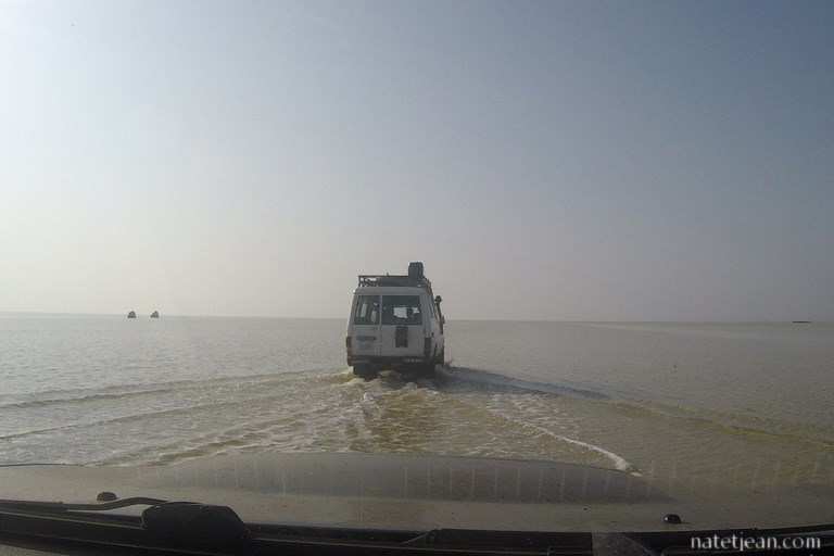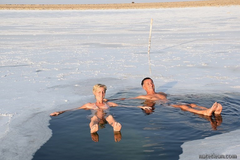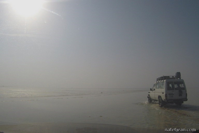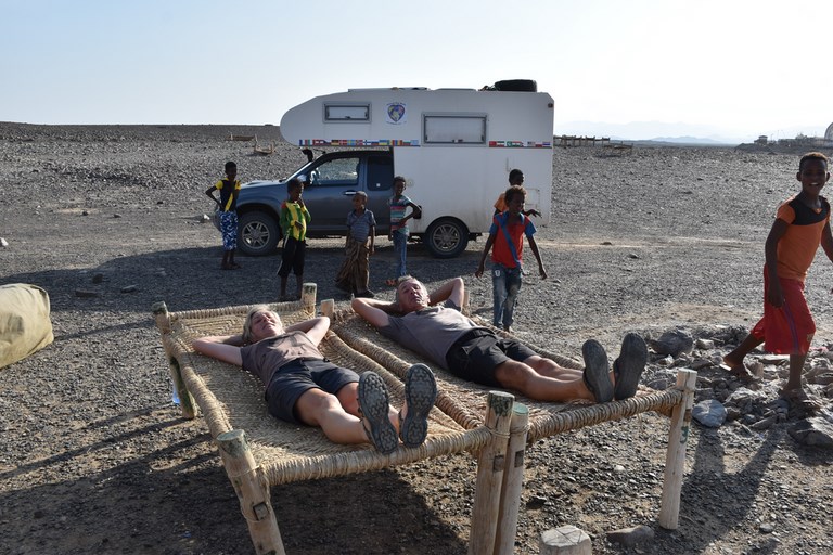 Mais avant de dormir, nous prenons le chemin du lac salé Assal situé à 135 mètres en-dessous du niveau de la mer. Nous roulons pendant quelques kilomètres sur une piste rocailleuse avant d'atteindre le lac qui, oh surprise, n'est pas asséché comme nous le pensions mais recouvert de quelques centimètres d'eau. On s'arrête après avoir roulé 5 minutes jusqu'à un trou d'eau où nous pouvons nous baigner. L'eau y est non seulement chaude mais surtout très salée, tellement salée que nous flottons sans effort et qu'il est impossible de descendre nos pieds au fond de l'eau. Nous assistons ensuite au coucher du soleil sur le lac avant de faire demi-tour pour aller dîner et dormir à Hamedela. Tout le monde dort en plein-air sur des lits en corde sauf nous qui restons dans le camping-car même si la température à l'intérieur atteint 37°C. Jean a bien essayé de passer la nuit à la belle étoile mais après seulement 1 heure dehors, il retrouvait son lit !