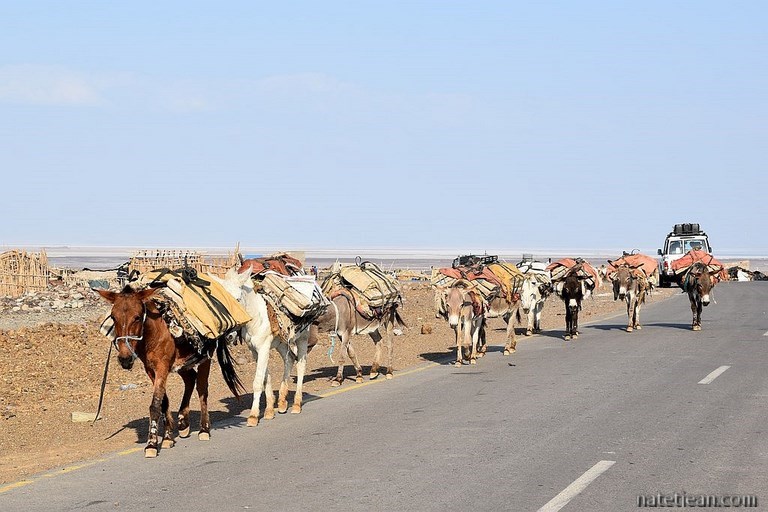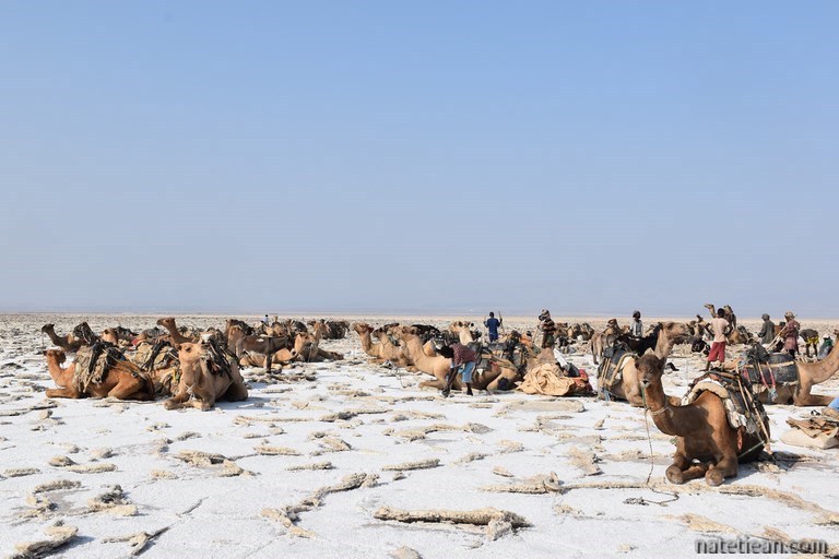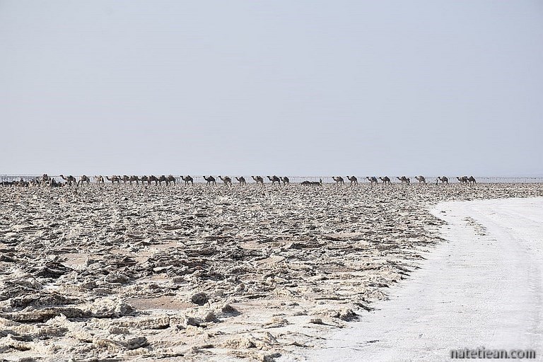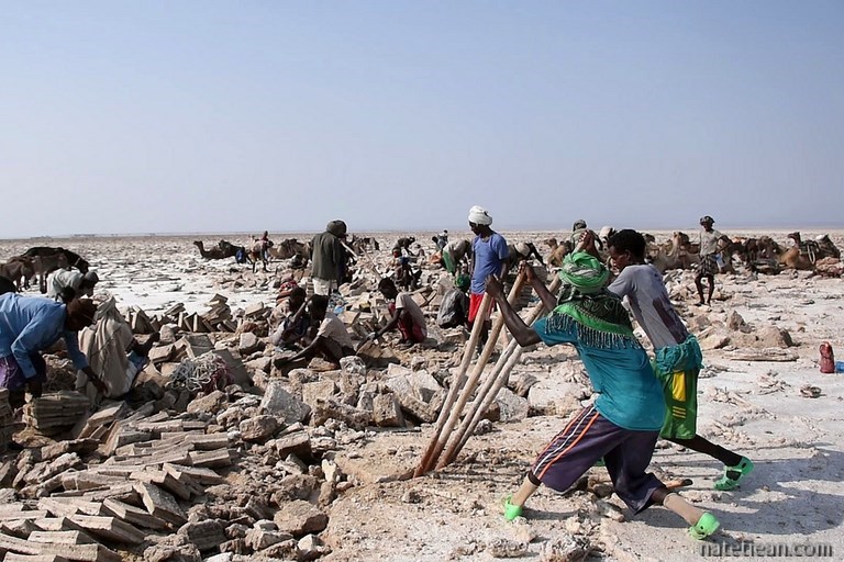 Cependant, aujourd'hui, ils sont bien là à travailler comme des forçats avec des pioches et des pieux pour décoller et tailler la croute de sel. Nous assistons à la récolte dans un endroit où le lac est déjà sec. Si le travail est dur, les Afars semblent en retirer une certaine fierté et s'amusent de nous voir les observer. Pour combien de temps pourront-ils encore exercer cette activité assez lucrative avant que les engins mécaniques prennent le dessus ? Déjà, certaines machines sont installées sur le lac ; le sel extrait est transporté par des camions et non des dromadaires et revendu à Mékélé, 75% du prix de celui récolté par les Afars...