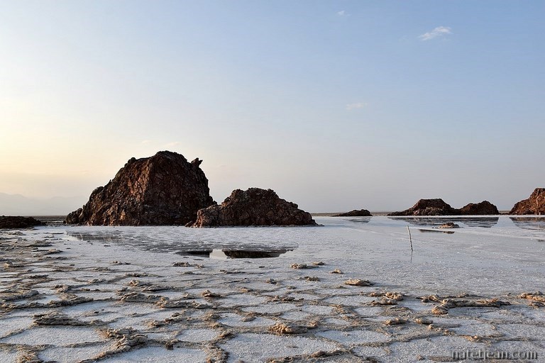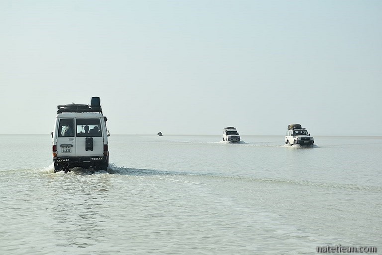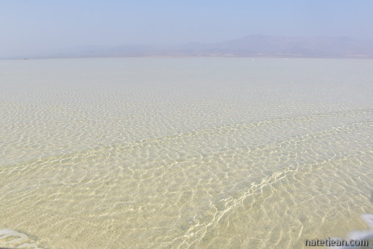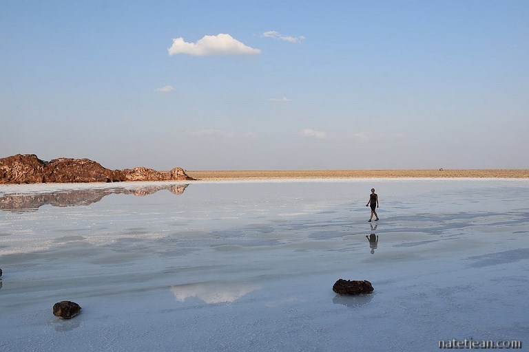 Nous passons environ 1 ou 2 heures sur place avant de retraverser le lac. De jour, la traversée dans l'eau est tout aussi impressionnante. En général, à la saison sèche, le lac est sec mais, comme la saison humide s'est terminée il n'y a que 3 semaines, il reste de l'eau. En juillet et août, l'eau peut atteindre, paraît-il, 50 cm et personne ne peut traverser le lac ni récolter le sel. Les Afars sont alors contraints de quitter l'endroit et de rejoindre les fermes et les champs du Tigré.