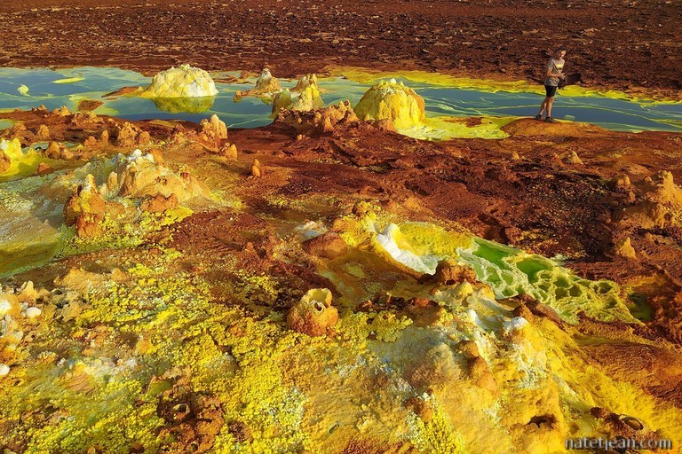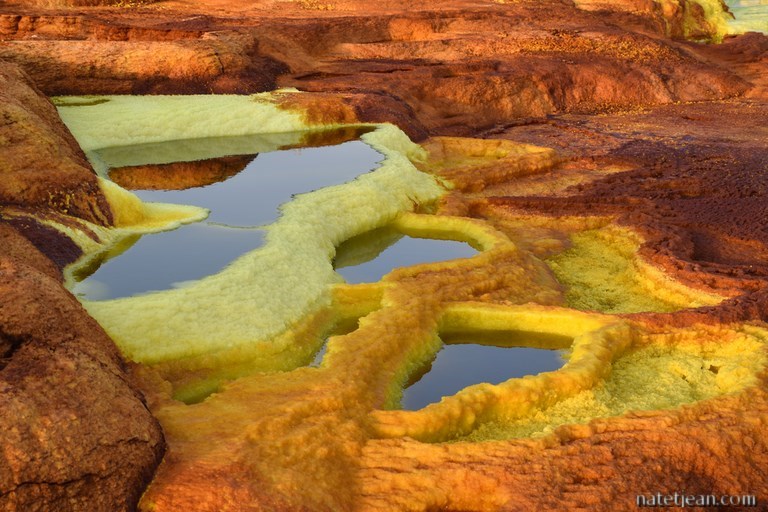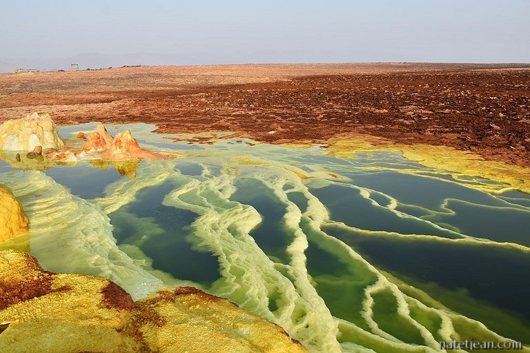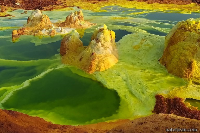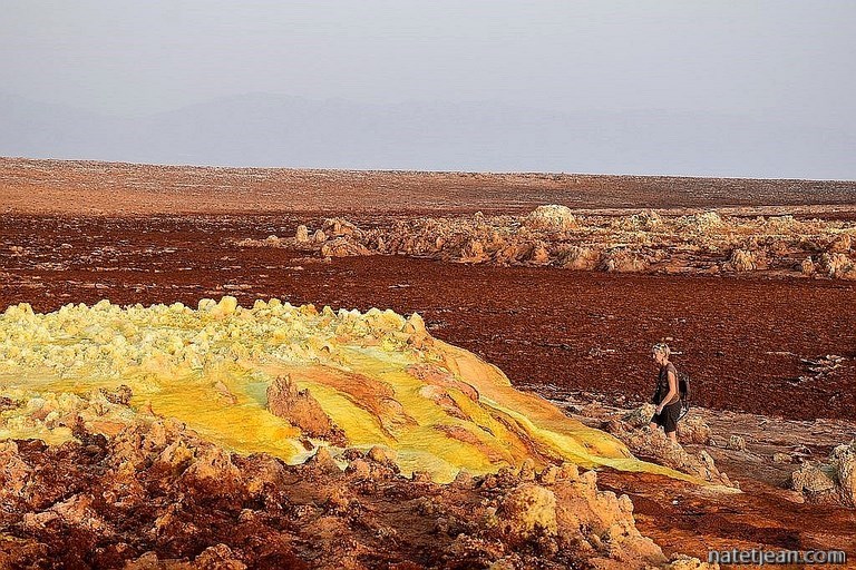 Le lendemain matin, réveil à 3h45, puis petit-déjeuner et départ pour la dépression du Dallol au centre du lac Assal. Cette fois, nous roulons pendant environ 1 heure sur le lac. L'eau est bien plus haute que la veille et nous roulons maintenant dans 20 cm d'eau. Il fait nuit et c'est un peu flippant. On suit la voiture des scouts (des gardes armés qui assurent la sécurité de notre convoi) de près de peur de tomber dans un trou. On arrive enfin au pied d'une île où l'on stoppe les véhicules pour partir à pied. Il est environ 6h et bien qu'il fasse seulement 31°C, on sue abondamment car l'air est très humide. Après quelques minutes de marche, on atteint les fameuses sources sulfureuses du Dallol et on en prend plein les yeux, du jaune, du vert, de l'orangée, les photos parlent d'elles-mêmes. C'est très beau et largement à la hauteur de nos attentes.