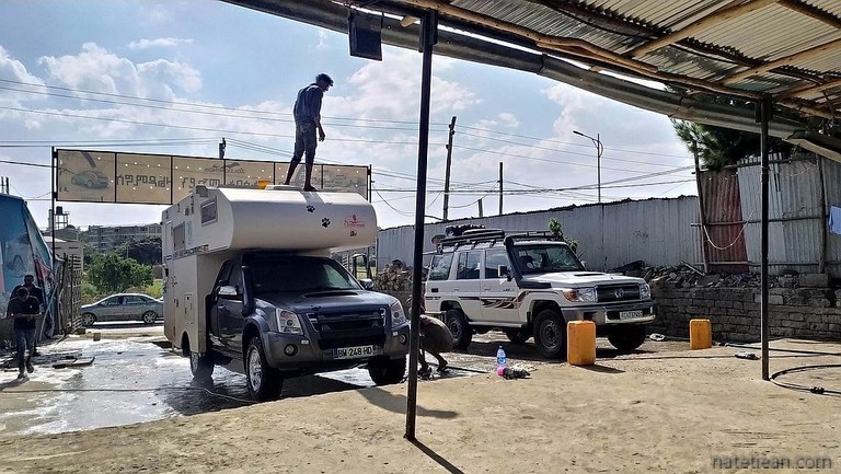 Nous reprenons la route pour revenir en milieu d'après-midi à Mékélé. Un des chauffeurs du groupe nous indique un endroit où laver notre véhicule qui est en croute-de-sel. Lavage intérieur-extérieur, graissage durant 2 heures durant et le camping-car est presque comme neuf !