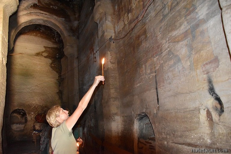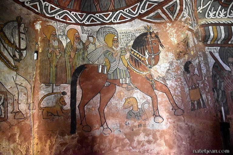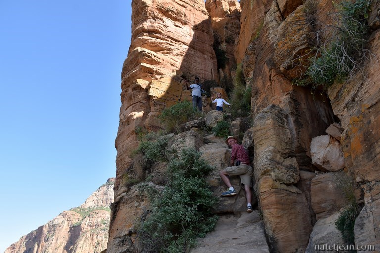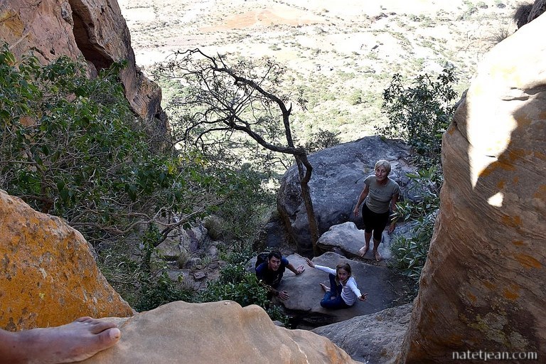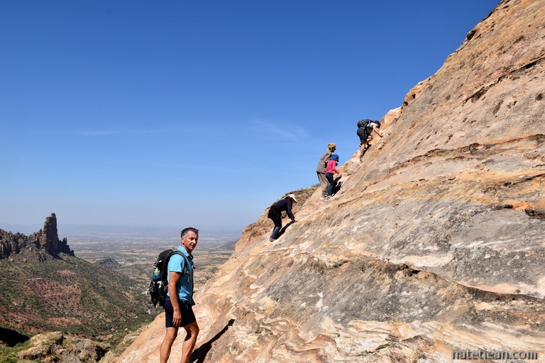 Le jour suivant, avant d'aller faire la visite de l'église d'Abuna Yemata, nous nous retrouvons tous, Alexis, Sandrine et leurs 3 enfants, Clément, Marie et leur petit garçon autour d'une table au Korkor Lodge, un endroit luxueux où le propriétaire, un Genevois, nous offre le camping sur sa piste d'atterrissage d'hélicoptères (le prix du repas dépassant largement le prix habituel d'un de nos bivouacs mais l'endroit le méritant). En début d'après-midi, le chauffeur et le guide de nos amis nous emmènent au pied du piton rocheux où se trouve l'église. Les plus petits restent en bas avec Sandrine car pour rejoindre l'église, il y a une marche de 500 mètres de dénivelé dont une partie d'escalade qui n'est pas faisable avec des très jeunes enfants. Même pour nous adultes, c'est assez impressionnant. Heureusement, pour la partie la plus périlleuse, nous sommes encordés. Arrivés en haut du piton rocheux, il reste quelques mètres à parcourir au-dessus du vide pour arriver à l'entrée de l'église d'Abuna Yemata. Cette église troglodyte, dédié à Yemata, l'un des 9 saints syriens missionnaires à l'origine de la chrétienté en Ethiopie, date du XIIIème siècle. A l'intérieur, de belles fresques représentent les saints et les apôtres. Une belle visite, aussi intéressante que palpitante.