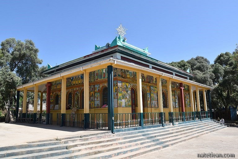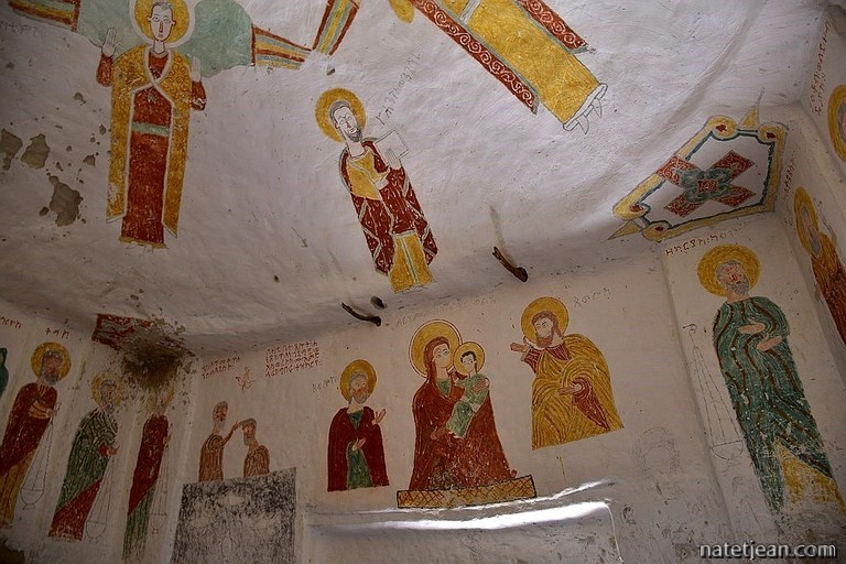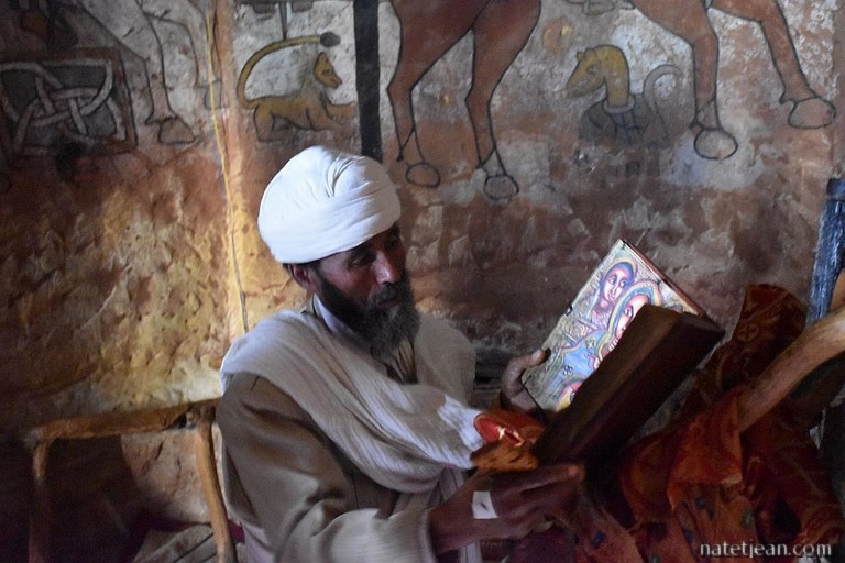 Le lendemain matin, nous visitons les 2 églises Abuna Daniel et Mariam Korkor se trouvant non loin d'Abuna Yemata. Cette fois, nous partons sans guide mais avec un scout, un garde armé, pas vraiment nécessaire mais plus ou moins imposé par le vendeur de tickets d'entrée. Il ne nous sert pas à grand-chose mais il est très sympa... Cette fois, la montée, bien qu'assez raide, ne comporte aucune difficulté. Sur place, nous visitons d'abord Abuna Daniel dont les fresques sont un peu ternies par le temps puis Mariam Korkor dont les peintures représentant Marie et l'enfant Jésus, Adam et Eve ou des animaux seraient les plus anciennes d'Ethiopie (XII ou XIIIème siècle). Là encore, une visite intéressante et des points-de-vue sur les montagnes du Gheralta époustouflantes.