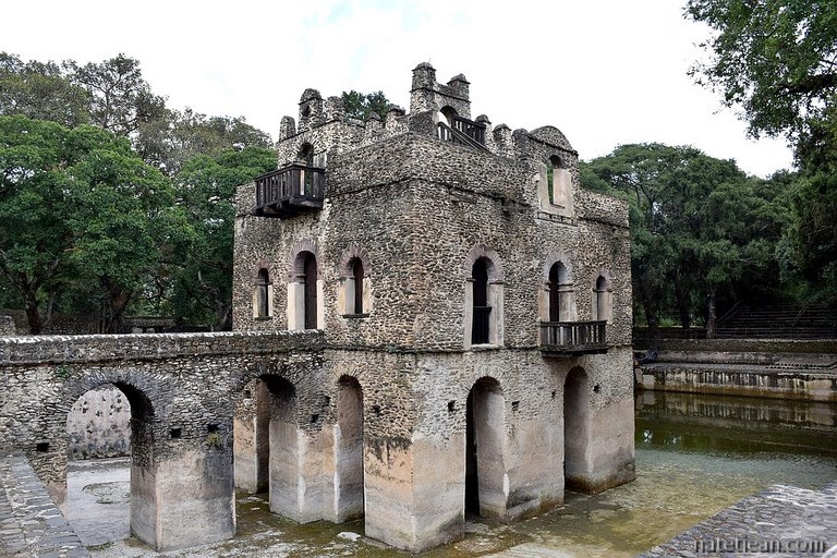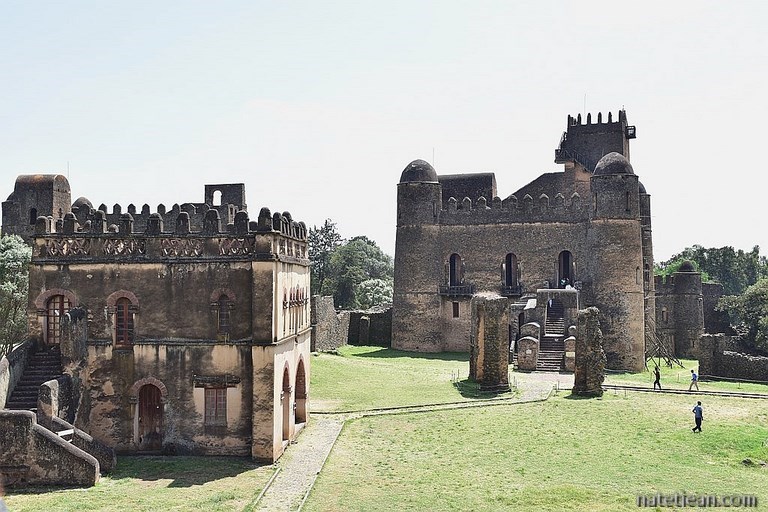 Nous arrivons en milieu de journée à Gondar. Nous parquons notre véhicule dans la cour de la pension Belegez. Ce n'est pas le plus bel hôtel de la ville mais, comme d'habitude, nous dormons dans le camping-car et, côté pratique, nous sommes à 2 pas de la cité fortifiée qui comprends plusieurs palais datant du XVII et XVIIIème siècles dont celui du roi Facilidas qui établit la capitale de l'empire à Gondar en 1635. Nous sommes aussi à moins de 2 km de l'autre site historique à visiter, les Bains du roi Facilidas où nous nous rendons également à pied. L'Afrique ne nous avait pas habitués à voir de tels monuments et nous sommes agréablement surpris de découvrir cette forteresse et ses châteaux.