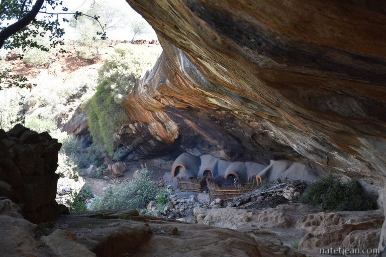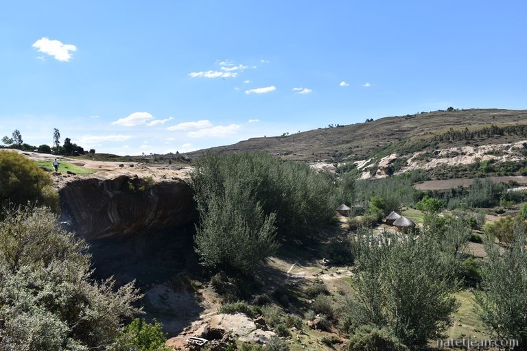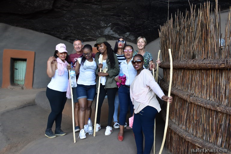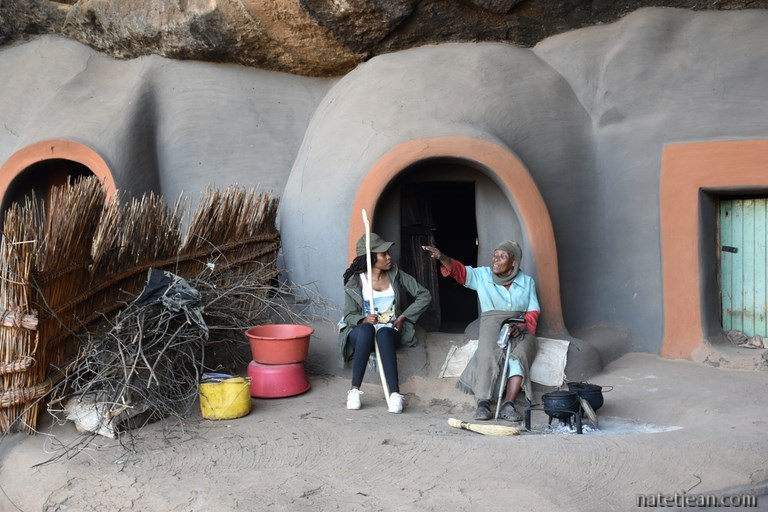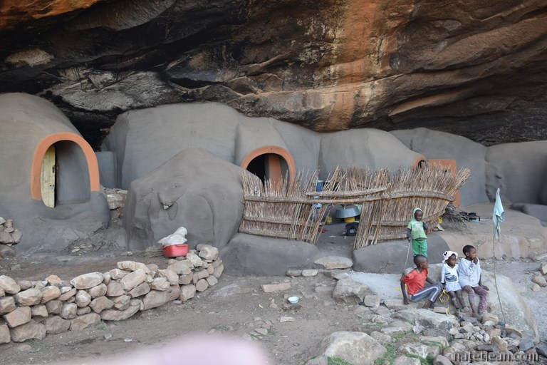 Après quelques kilomètres d'une belle route au milieu d'une campagne peu habitée, nous prenons la direction de Ha Kome et ses maisons troglodytes. En quittant la route principale, les villages et la population sont encore plus clairsemés. Les maisons troglodytes de Ha Kome, qui constituent l'attrait touristique du coin, se visitent avec un guide. Il s'agit de quelques huttes en terre construites dans une grotte, parait-il, au XIXème siècle. Elles sont encore habitées par 3 mamies octogénaires qu'on a l'impression de maintenir ici pour le folklore. Elles n'ont pas l'air plus mal qu'ailleurs et, au moins, elles ont de la visite; aujourd'hui, quelques touristes européens et une bande de jeunes citadins habitant la capitale, Maseru, qui semblent heureux de s'entretenir avec leurs ainées.