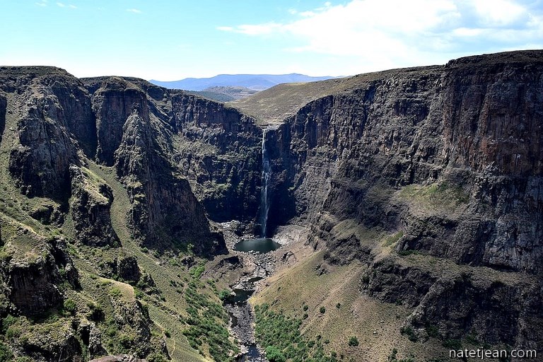 Nous avions la crainte de ne voir aux Malentsunyane Falls, comme aux chutes de Tugela de l'autre côté de la frontière, couler qu'un mince filet d'eau mais, malgré la sécheresse qui semble s'imposer dans la région, le débit de la chute de 204 mètres de haut est, sans être tumultueux, très correct.