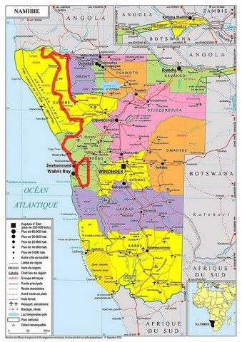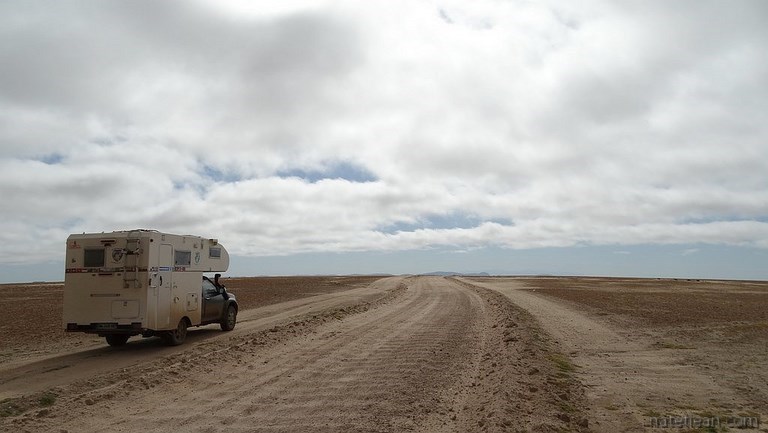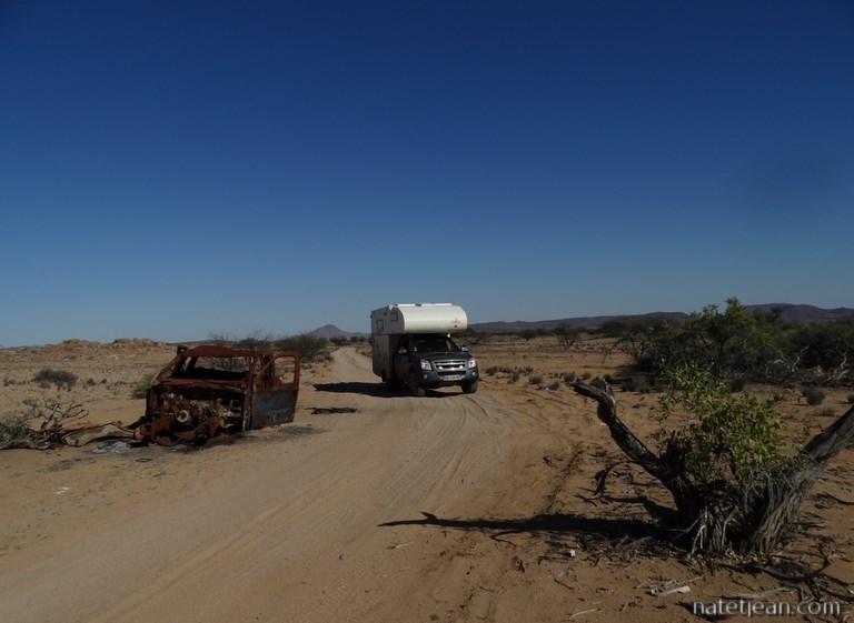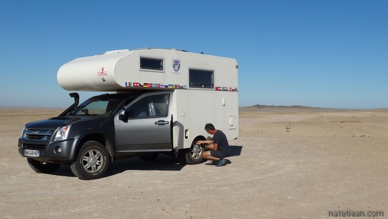 Notre plan initial était de débuter le voyage tranquillement, de faire connaissance avec la Namibie en empruntant les axes principaux avant de s'attaquer aux pistes cassantes du désert mais, après une semaine passée à attendre à Walvis Bay, nous avons envie de grands horizons et besoin de savoir comment va se comporter le camping-car sur les pistes. Le Namib Naukluft national park nous parait un bon terrain de jeu pour le tester.
