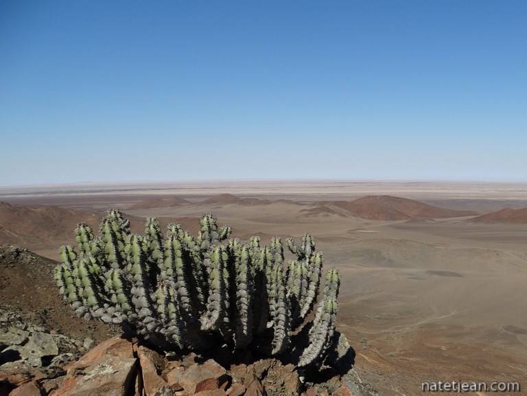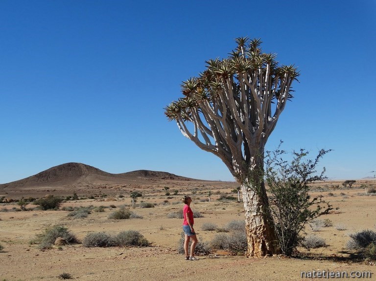 Le Naukluft national park fait partie du désert du Namib. Bien que ce soit un désert, on va y rencontrer de nombreux animaux tels que des autruches, des springboks, des oryx (ou gemsbok), des phacochères, des écureuils et des renards. La faune, bien que clairsemée, est également très diversifiée. Au ras du sol, on trouve la welwitschia, une plante qui donne des fruits ressemblant à des melons et qui est très appréciée des habitants du désert. Cette plante a donné son nom au premier trail que nous empruntons pour nous rendre dans le canyon de Goanikontes, le Welwischia self-drive trail. L'endroit où règne le silence total est magnifique. C'est notre premier coup de cœur namibien. Déjà un coup de cœur !