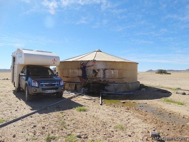 Le bassin autour du barrage est presque sec. Depuis combien de temps n'y a-t il pas eu d'eau ici ? Et pourtant, de l'eau, on va en trouver. Nous étions partis avec un minimum d'eau dans les réservoirs afin d'alléger le véhicule mais, si nous voulons rester encore une nuit, il nous faut un peu d'eau. Sur notre carte, un point appelé Gensbokwater. Jean en est sûr, il y a de l'eau. Effectivement, au milieu de rien, un immense réservoir déverse son trop plein. Un entonnoir et un tuyau nous permettent de refaire le plein.