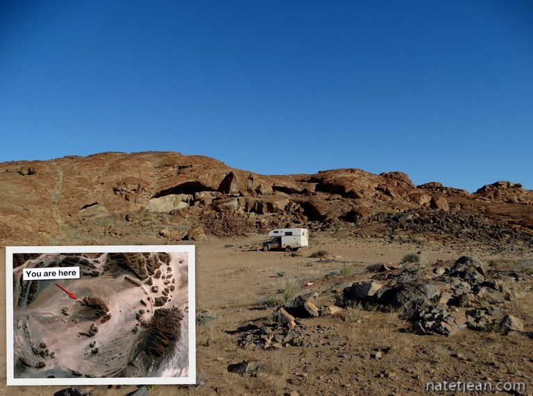 Le soir, nous bivouaquons dans un camp rudimentaire, Groot Tinkas. Le chemin qui y mène est difficile et très cassant. Nous sommes ce soir seuls au monde. Nous guettons les animaux depuis notre emplacement cependant, nous ne verrons aucun mammifères mais beaucoup d'oiseaux.