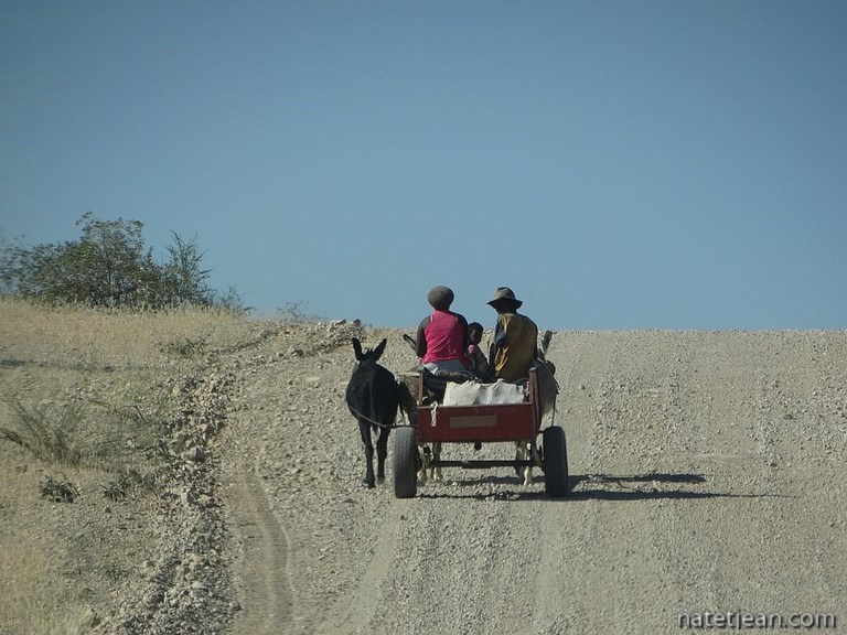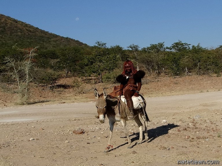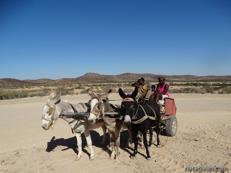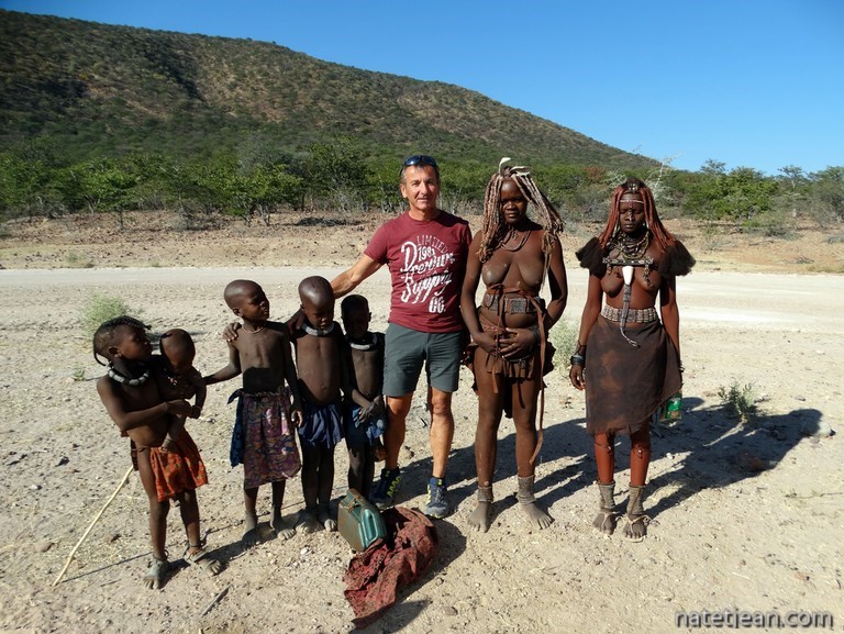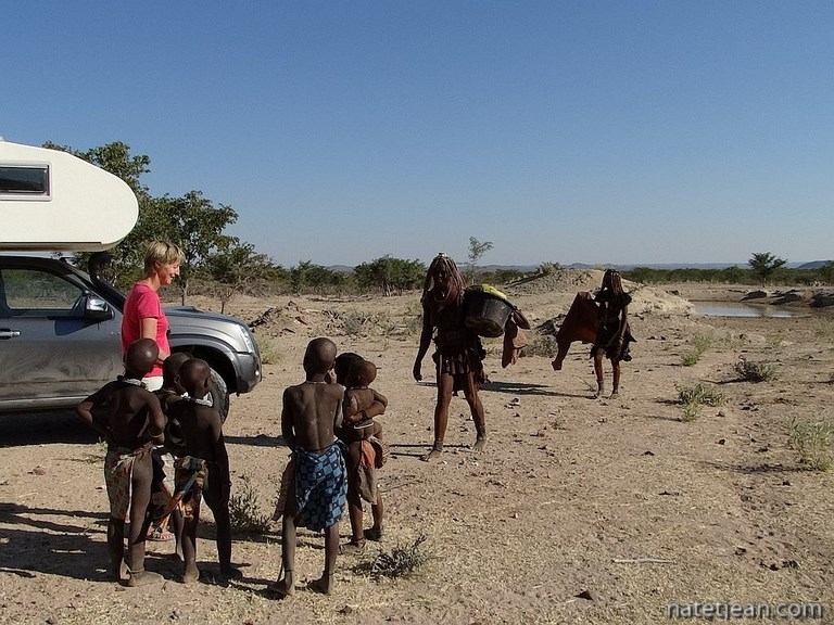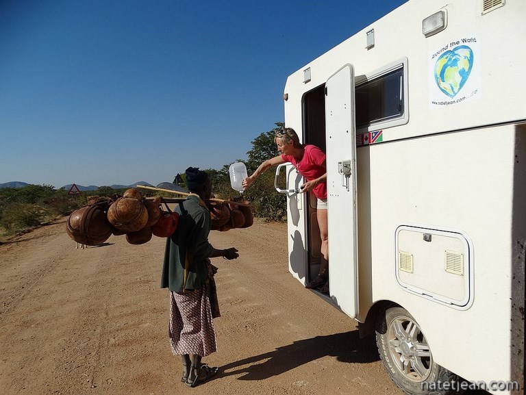 Les jours suivants, nous ferons d'avantage de rencontres. D'abord parce que nous rejoignons des routes principales, les routes C35 et C38 (toujours pas goudronnées mais en meilleur état que les pistes d'où nous sortons) et que la région du Damaraland est d'avantage peuplée. Au bord de la route se succèdent des petits kiosques d'artisanat. Les femmes, en habit traditionnel Himba ou Herero dansent en apercevant notre véhicule afin de nous attirer. Les enfants, eux, font l'aumône en réclamant de l'eau ou à manger.