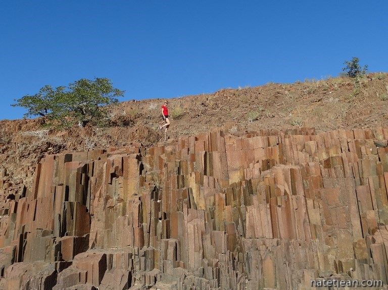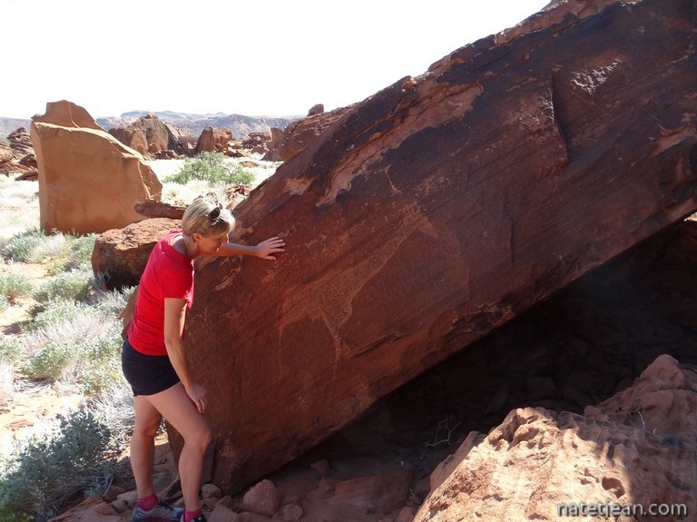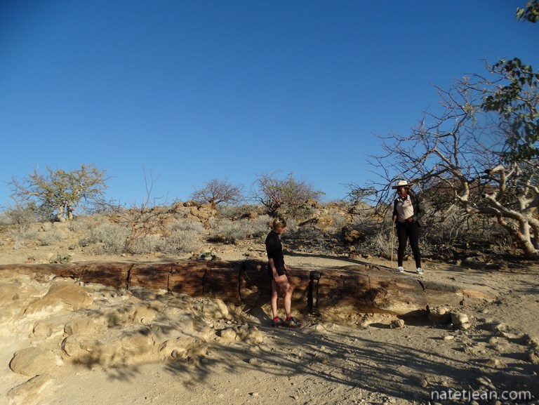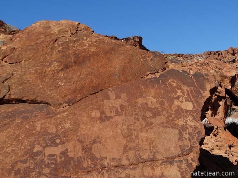 Sur notre route, à Twyfelfontein, se trouvent des sites à visiter comme la Petrified Forest où quelques palmiers millénaires charriés par une crue exceptionnelle se sont retrouvés "pétrifiés" à cet endroit. La visite ne vaut pas vraiment le détour, tout comme celle d'Organ Pipes où des roches ressemblent à de grandes orgues En réalité, le seul endroit qui mérite la visite est le site où se trouvent des gravures pariétales représentant, pour la plupart, des animaux. C'est un très beau site qui, comme les précédents, se visite avec un guide mais qui est vraiment intéressant. Par contre, il fait une chaleur de plomb et la visite se fait à petit pas pendant près de 2 heures; d'après notre guide, ce n'est rien en comparaison des 50°C atteints en été.