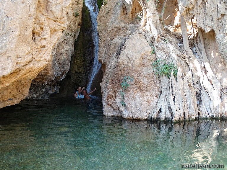 En route vers Opuwo, au nord de Warmquelle, nous faisons un détour vers les chutes d'Ongongo. Pour y aller, la piste est vraiment défoncée (boîte courte obligatoire) mais cela vaut le coup. Nous nous baignons dans un petit bassin alimenté par une cascade d'eau tiède.