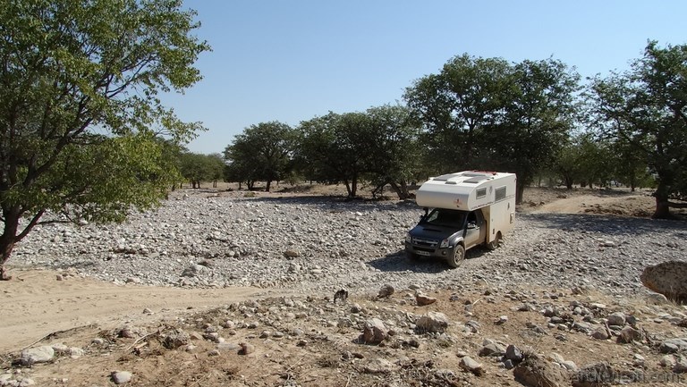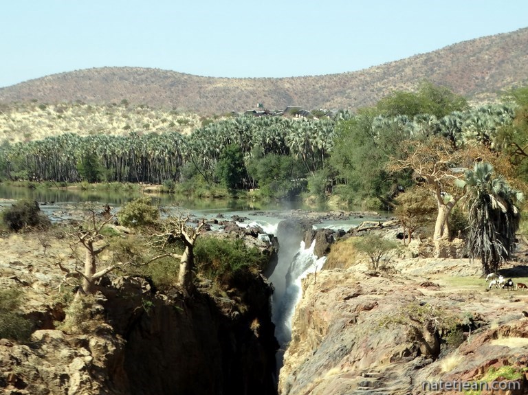 Il semble que nous ayons bien fait car, arrivés à la hauteur de Onduzu après avoir bifurqué à Epembe, nous arrivons à la fameuse piste le long de la rivière, nous nous apercevons que celle-ci est très difficile. Il y a de nombreux gués qui, même à sec, sont difficiles à passer. Nous mettons 3 heures pour faire les 45 km pour arriver aux chutes de Ruacana, petit filet d'eau à cette période de l'année que l'on peut apercevoir depuis l'usine hydroélectrique NamPower sans nécessairement passer la frontière angolaise.