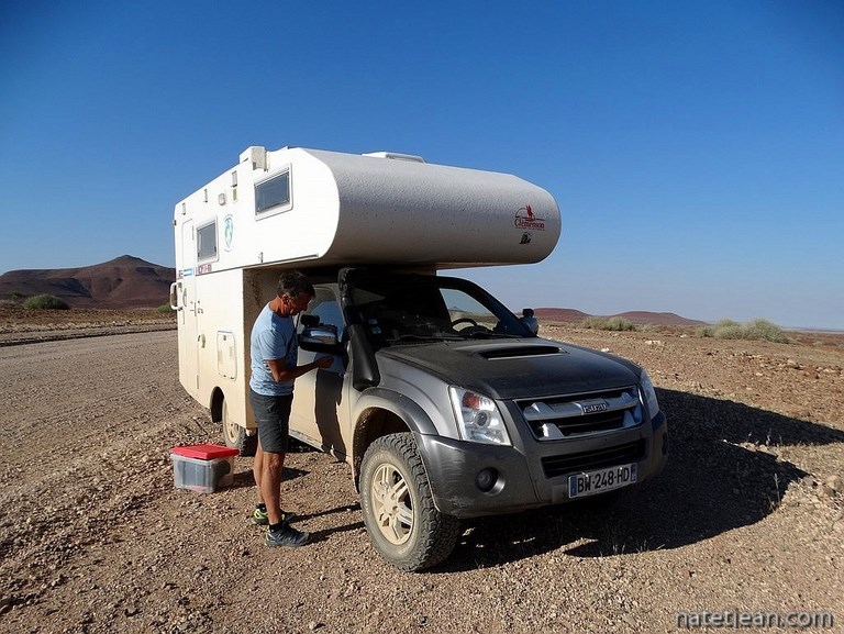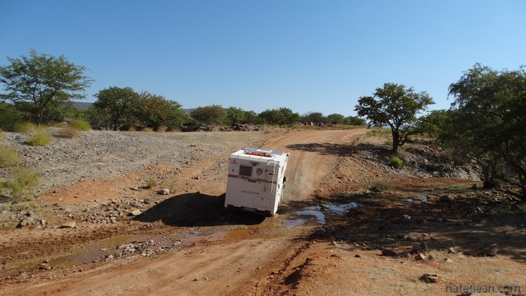 C'est également à Opuwo que nous faisons laver le véhicule qui, depuis Cap Cross, a la couleur des Himbas. Malheureusement, nous oublions de protéger la caméra de recul qui finit par prendre l'eau. Il faudra donc s'en passer pour le reste du voyage.