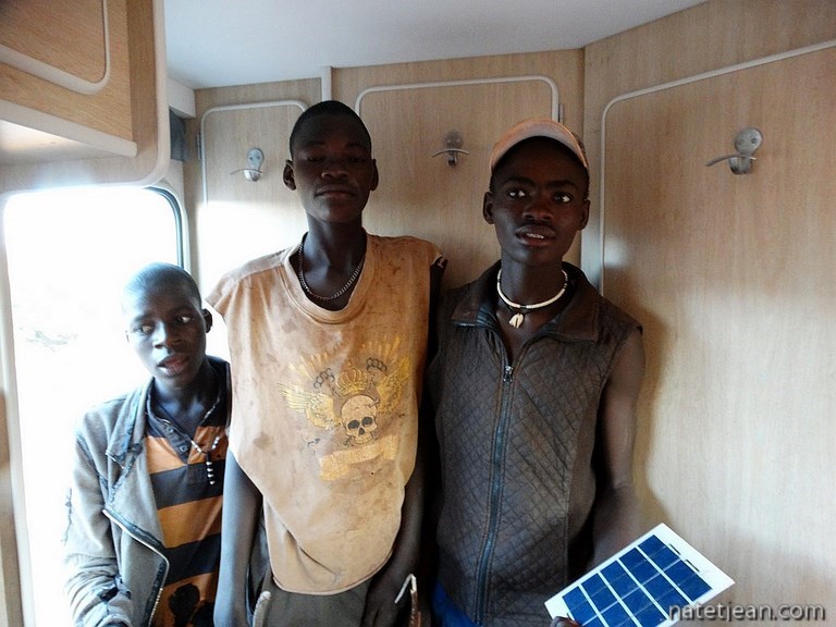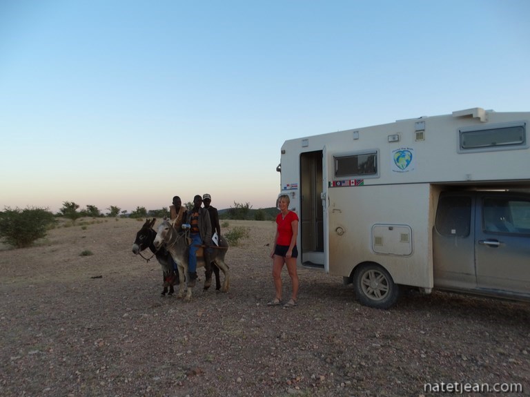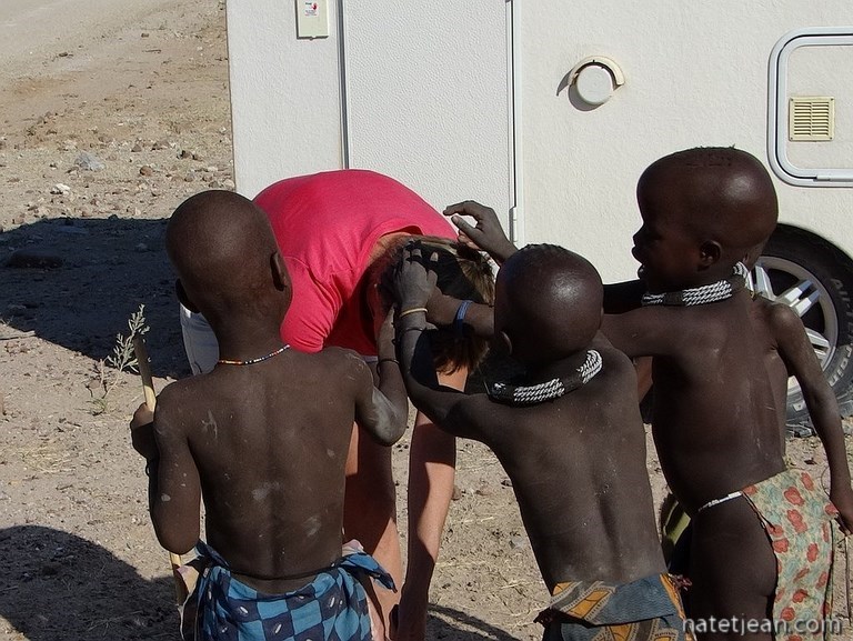 Un peu plus tard sur la route, alors que nous sommes arrêtés, de très jeunes enfants viennent à notre rencontre et nous réclament de l'eau. Alors que je leur mets un peu d'eau dans leur récipient, ils touchent mes cheveux, la peau de mes jambes et de mes bras, mes bijoux. Nous les intriguons. Leurs mères les rejoignent. Nous faisons des photos avec elles et les enfants. Elles visitent le camping-car. Une fois encore, notre conversation se fait par gestes car nous ne parlons pas la même langue.