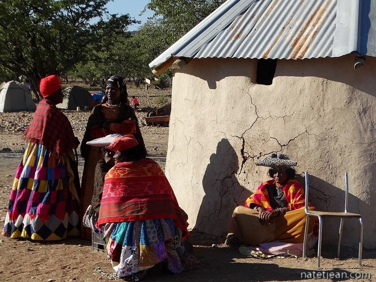 A Opuwo, petite ville où nous faisons provision de diesel, d'eau et de nourriture et où nous faisons notre premier camping afin de faire une pause confortable, toutes ces ethnies sont encore mélangées. Malheureusement, elles vivent dans une sorte de bidonville très misérable qui nous fait détester l'endroit.