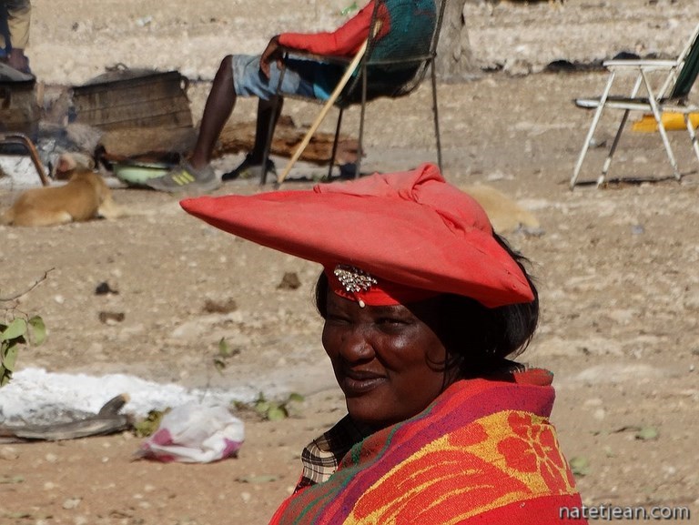 A l'opposé, les femmes Herero portent de longues robes et des chapeaux à l'occidental mais d'un siècle passé.