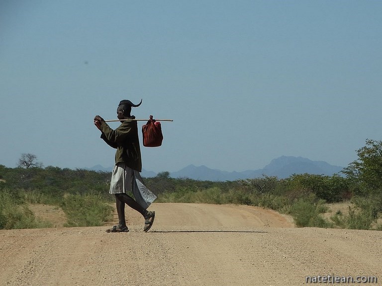 Peu fréquentées par les véhicules mais pas désertées par les bergers et leurs troupeaux. Tout le long de la route d'Opuwo à Epupa Falls, nous rencontrons des Himbas. Beaucoup nous réclament de l'eau et à manger. Nous voudrions nous arrêter à midi pour déjeuner mais il y a toujours quelqu'un autour de nous qui nous réclame quelque chose. Nous donnons un peu de nourriture puis nous repartons afin d'être tranquilles mais, à chaque fois, cela recommence. On finit par s'arrêter et partager notre repas en trois avec un Himba.