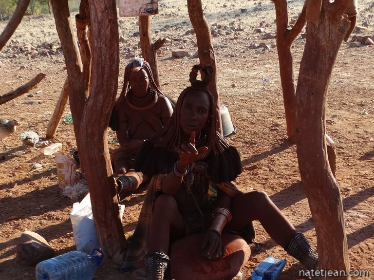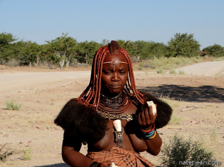 Les Himbas sont vêtus de pagnes en peau de bêtes; leur peau et leurs cheveux sont recouverts de beurre et de terre ocre et ils sont parés de nombreux bijoux.